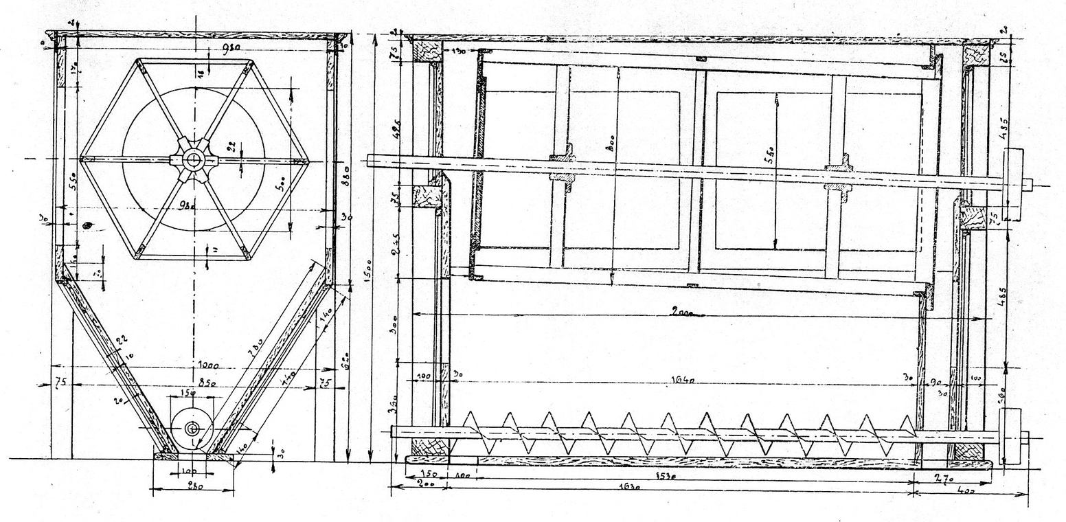 Usazení strojů ve mlýnici, hranolový předvysévač se šnekovým dopravníkem nahoře, pod ním vysévač moučný  –  kreslil: D. Veverka 2008.