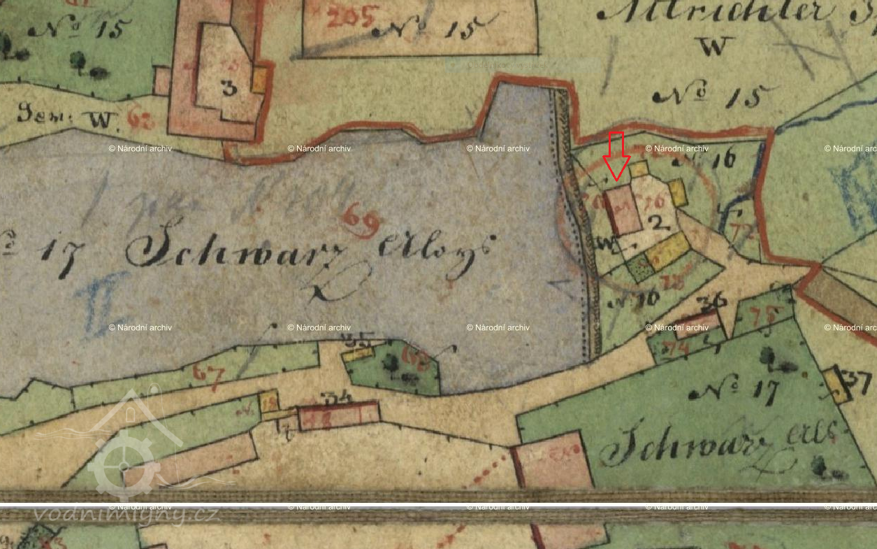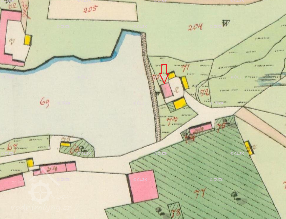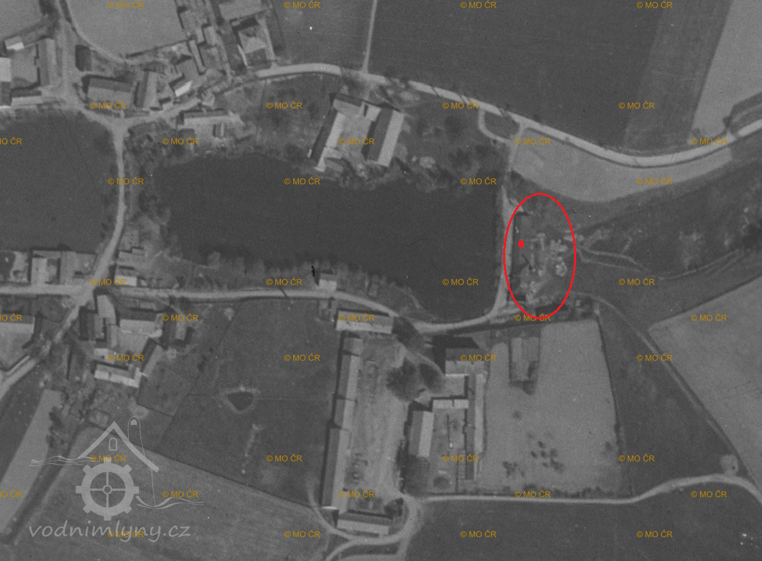 Nad mlýnem bylo na potoce několik rybníků. Mlýn stál několik metrů pod hrází rybníka zvaného Dolní.