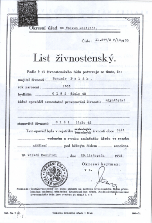 1896 mlýn koupil za 24.000 K Josef Polák (* 1866, Radostín) s ženou Amálií (* 1876, Uhřínov)