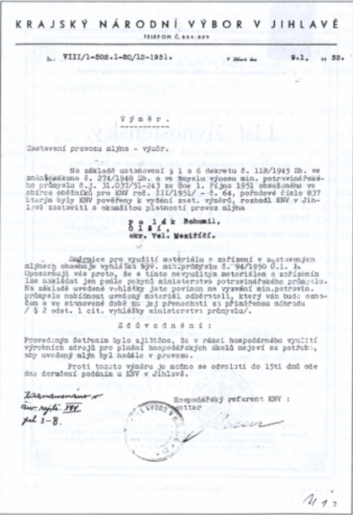9.1.1952 výměrem KNV Jihlava definitivně zastaven provoz.