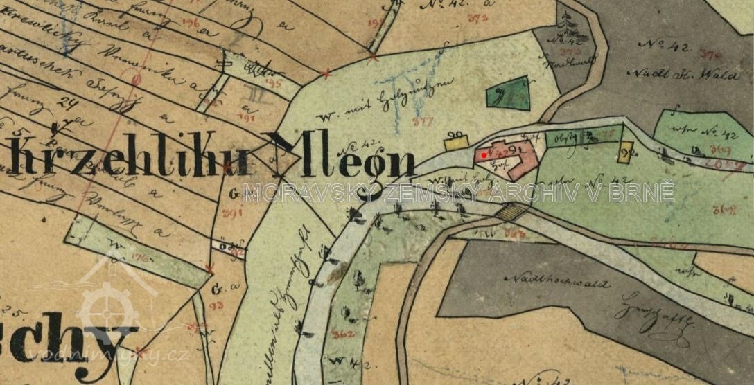 1695 urbář Velkomeziříčský: mlýn náleží k Vídni (až do konce měl většinu pozemků na vídeňském katastru), Matouš Křehlík ml. platí o sv. Jiří a sv. Václavu po 13 kr. úroku, místo odváděného sýra platí 15 kr.