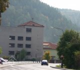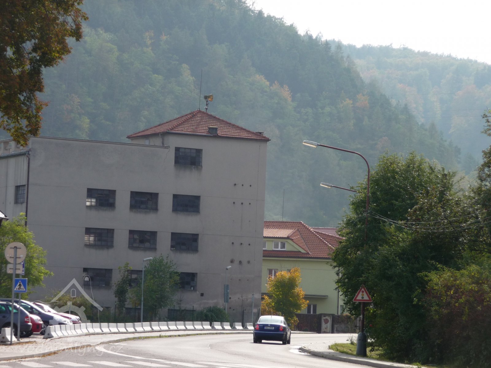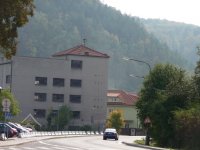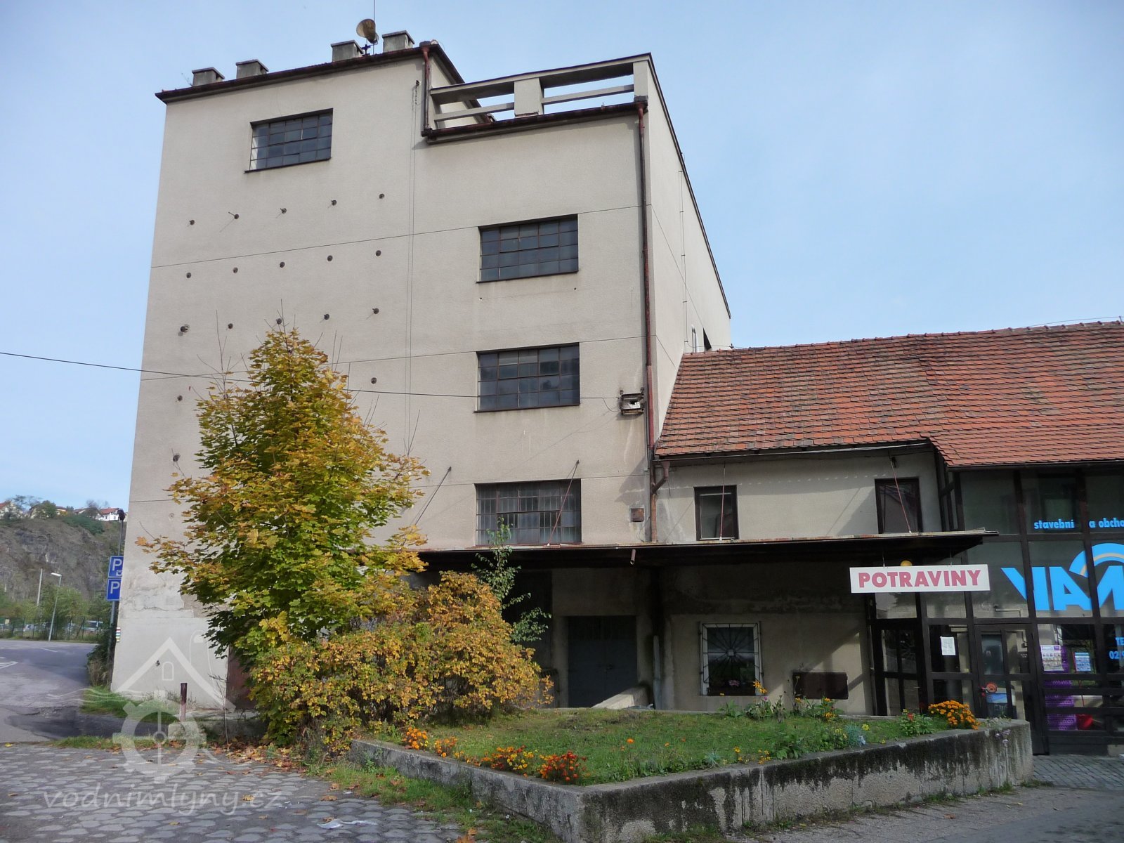 Mlýnice a další budova mají společnou zeď, mlýnice je čtyřpatrová, další budova jednopatrová.