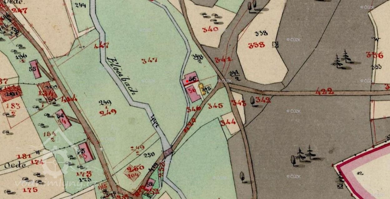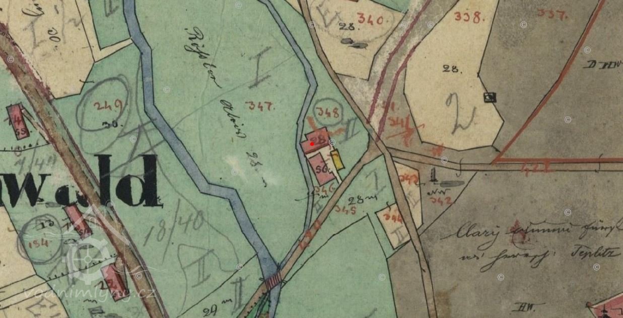 Zbořený mlýn asi 500m jihovýchodně od kostela Neposkvrněného početí P. Marie, blízko parku J. W. Goetha. V těsné blízkosti bývalého mlýna se nachází vodojem.