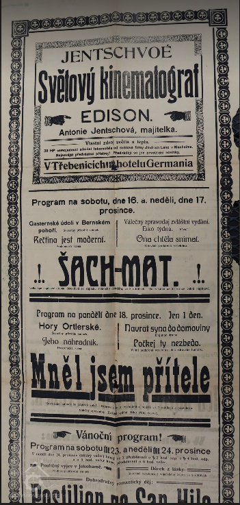 Po 1. světové válce koupil mlýn od vdovy po Josefu Wunderovi Josef Jentsch. Ten změnil mlýn na výrobnu dřevité vlny a stodolu přestavěl na kino Edison. To mělo lepší vybavení než kino v Teplicích. Protože se Josef Jentsch znal s producentem Milošem Havlem, mohl si půjčovat i filmy, které ještě nebyly uvedeny do velkých kin. Aby je mohl urychleně vrátit, dělal někdy i tři představení za den (dopolední, odpolední a večerní) , nejčastěji v sobotu nebo v neděli a ještě večer jel film vrátit do Prahy.