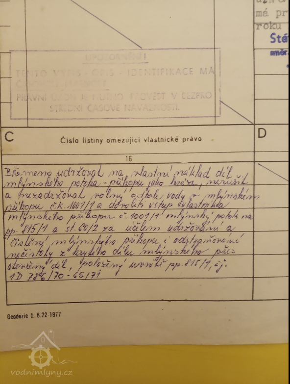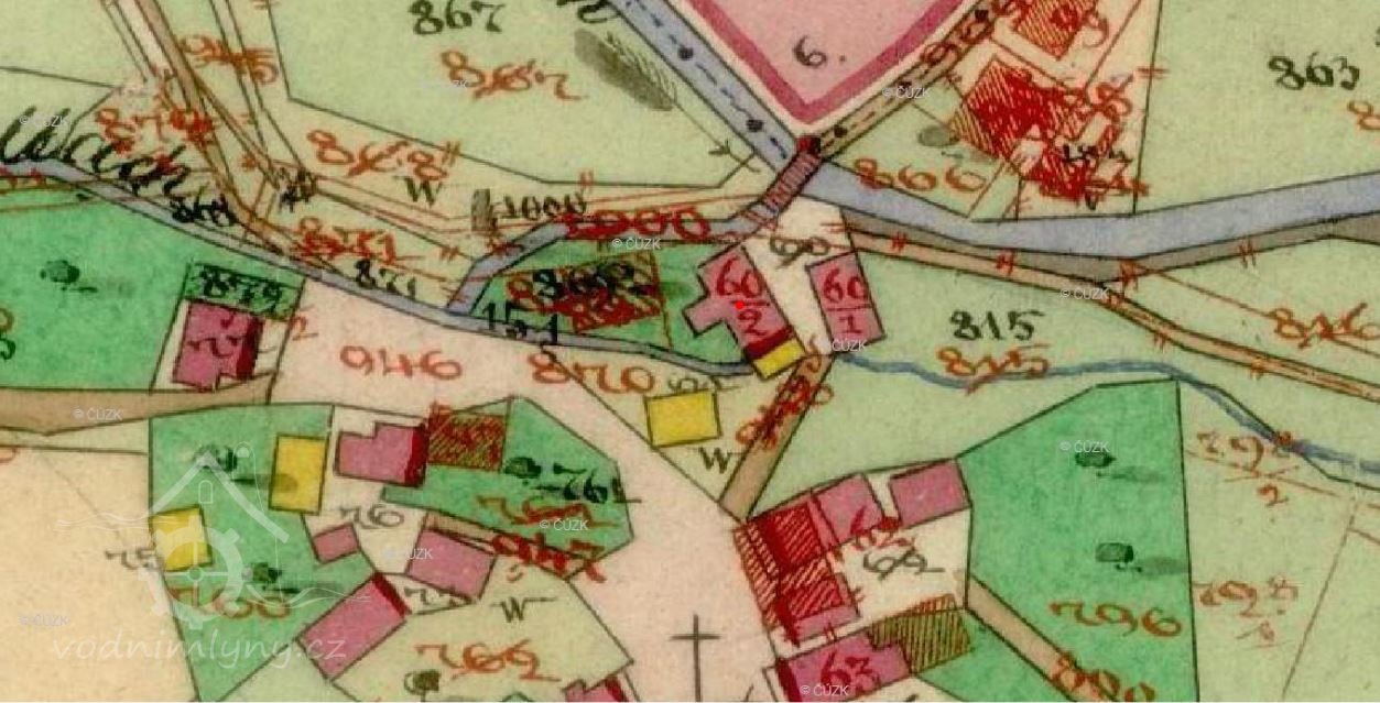 Popis1930 - 1 kolo na svrchní vodu, průtok 0,125 m3/s, spád 4,5 m, výkon 4,9 HP.