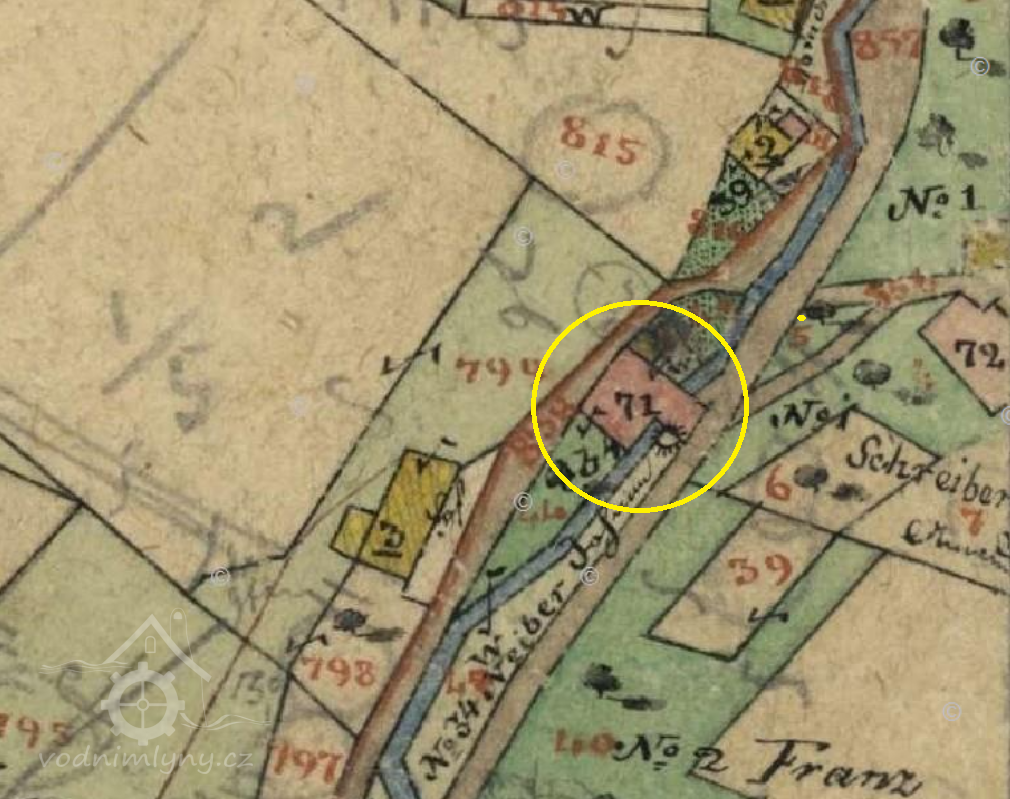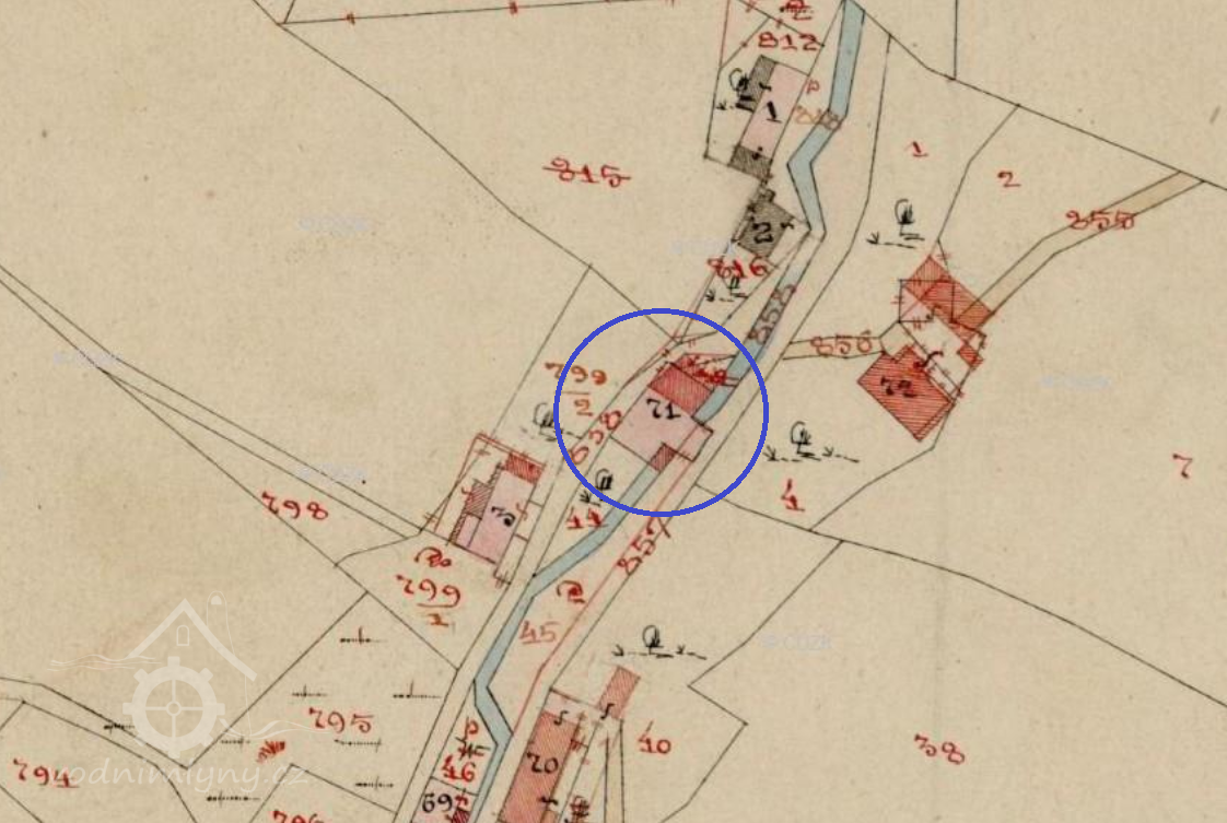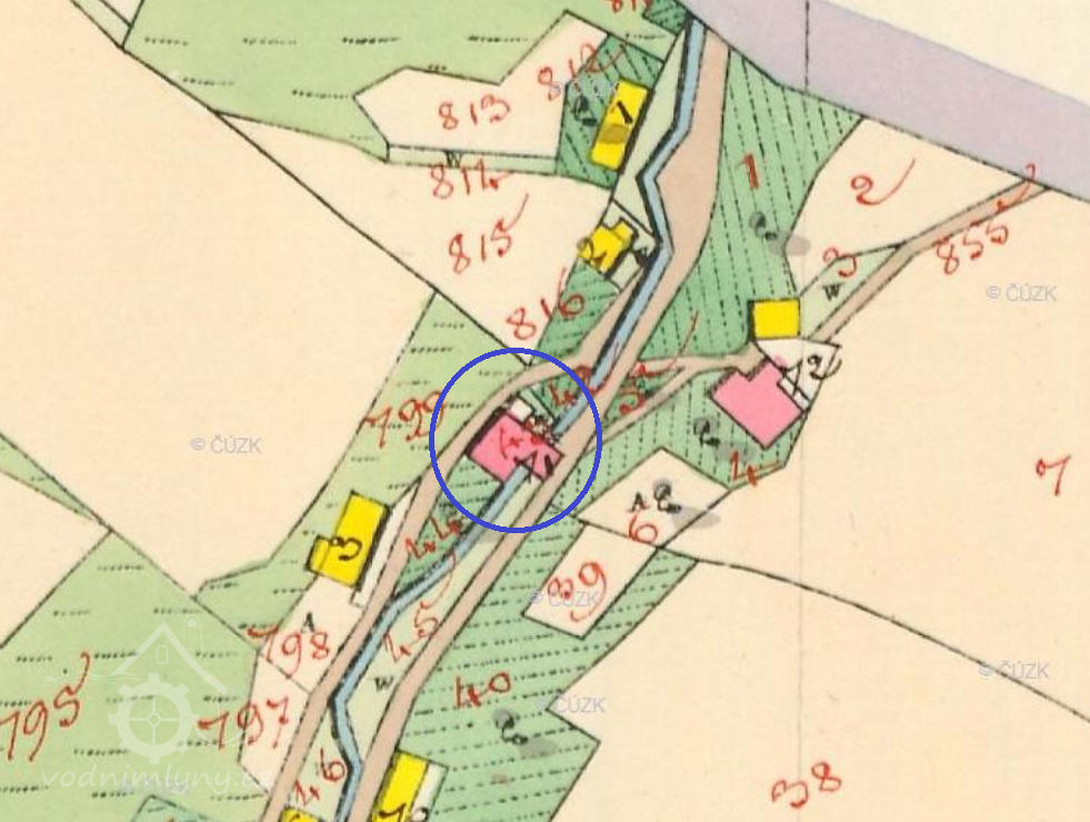 Popis1930: 1 kolo na svrchní vodu, hltnost 0,075 m3/s, spád 4,1 m, výkon 2,7 HP