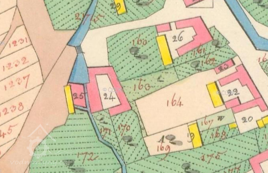 Prostřední mlýn v obci, 1930 pouze šrotovník, dnes z větší části zbořený a na jeho místě novostavby.