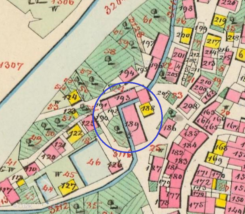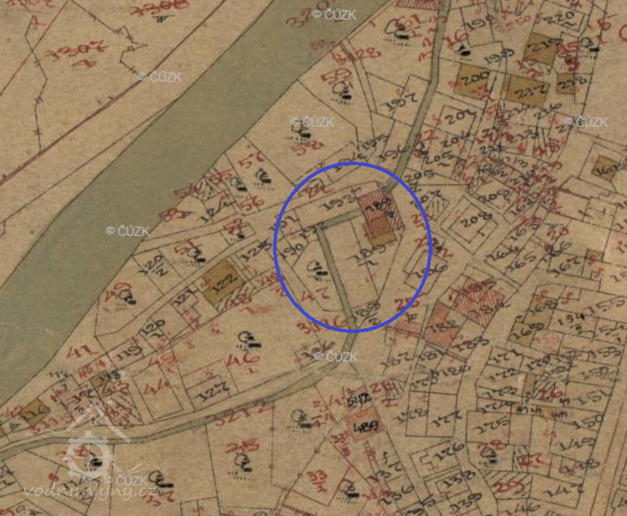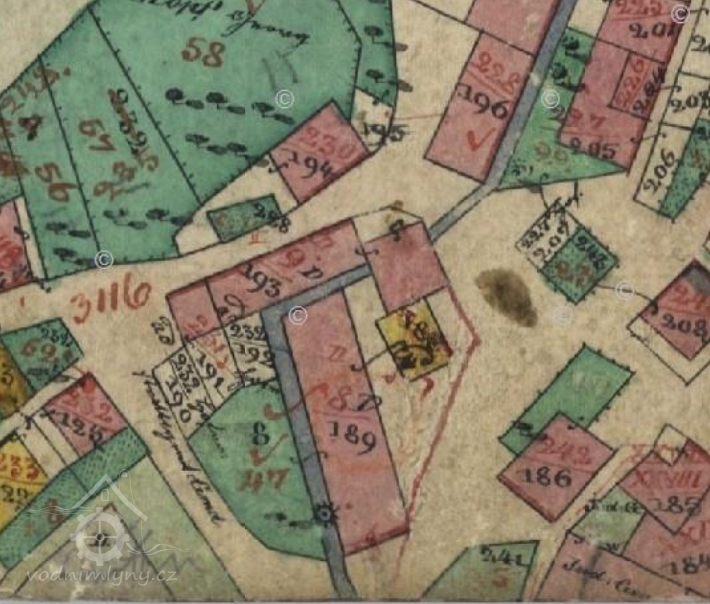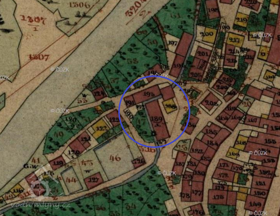 1748 Tereziánský katastr: mlýn o 3 kolech na nestálé vodě