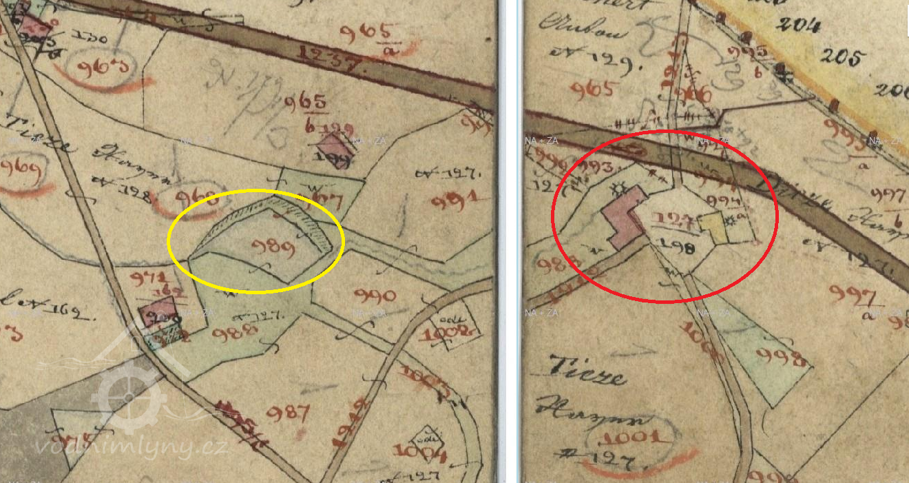 1843 - Xawer Tieze. Vyznačeny dvě budovy s vodním kolem, zděná byla pravděpodobně pila, dřevěná mlýn. Na II. vojenském mapování značen jen obilný mlýn.