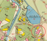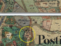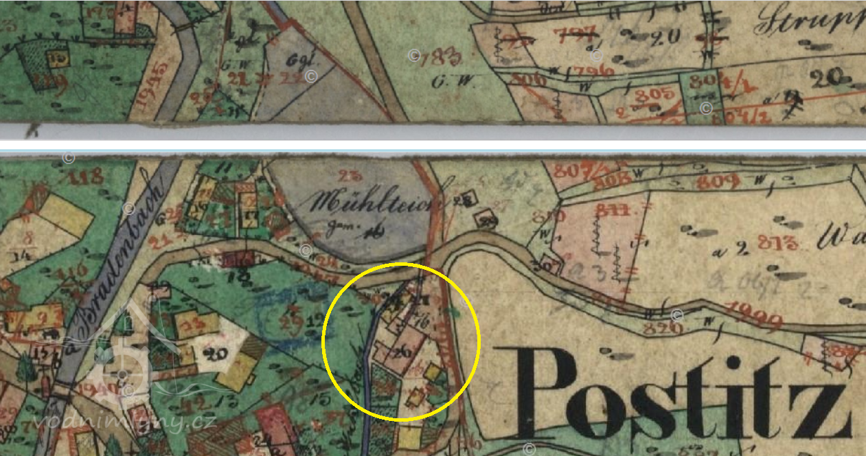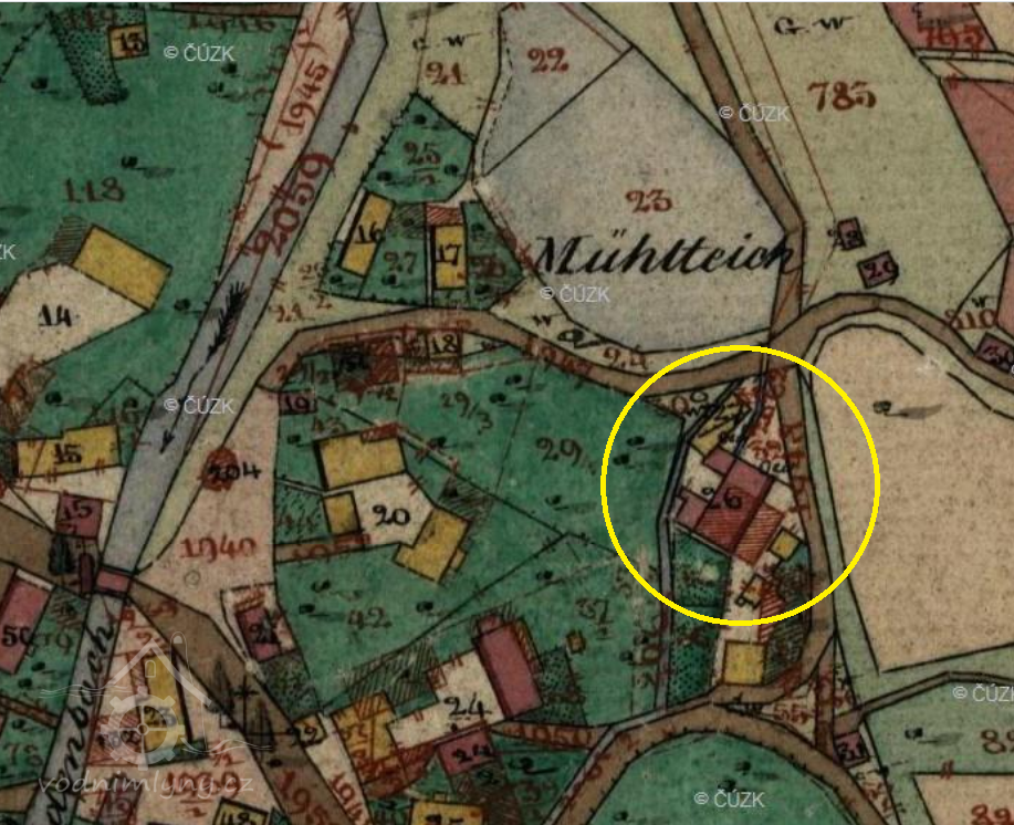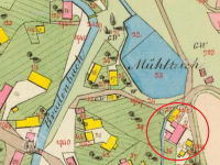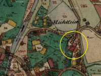 Horní z dvojice mlýnů v centru Božtěšic, nad ním se nacházel menší rybník, provoz ukončil po požáru 1894.