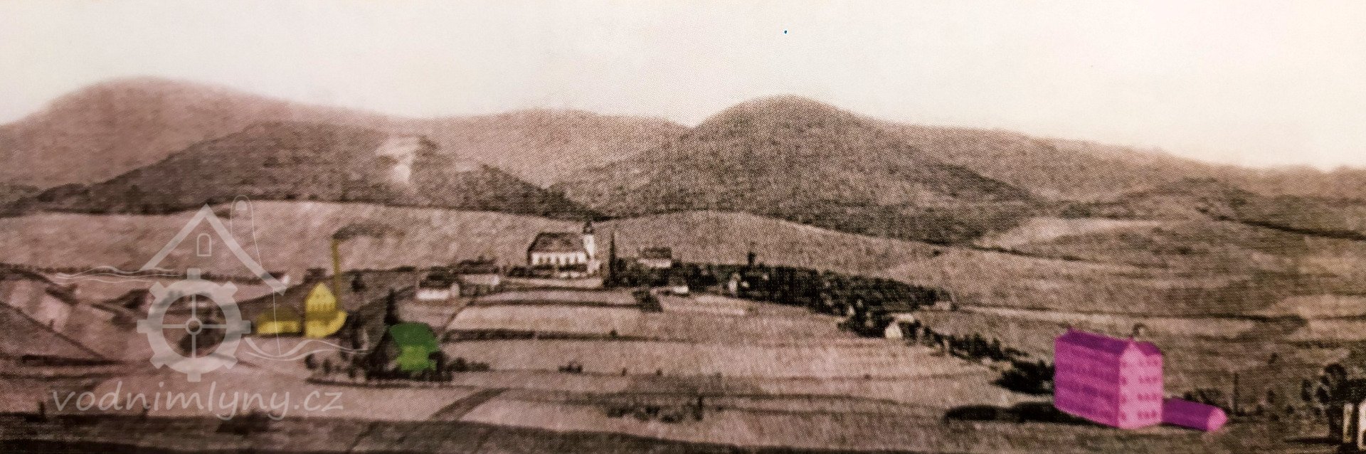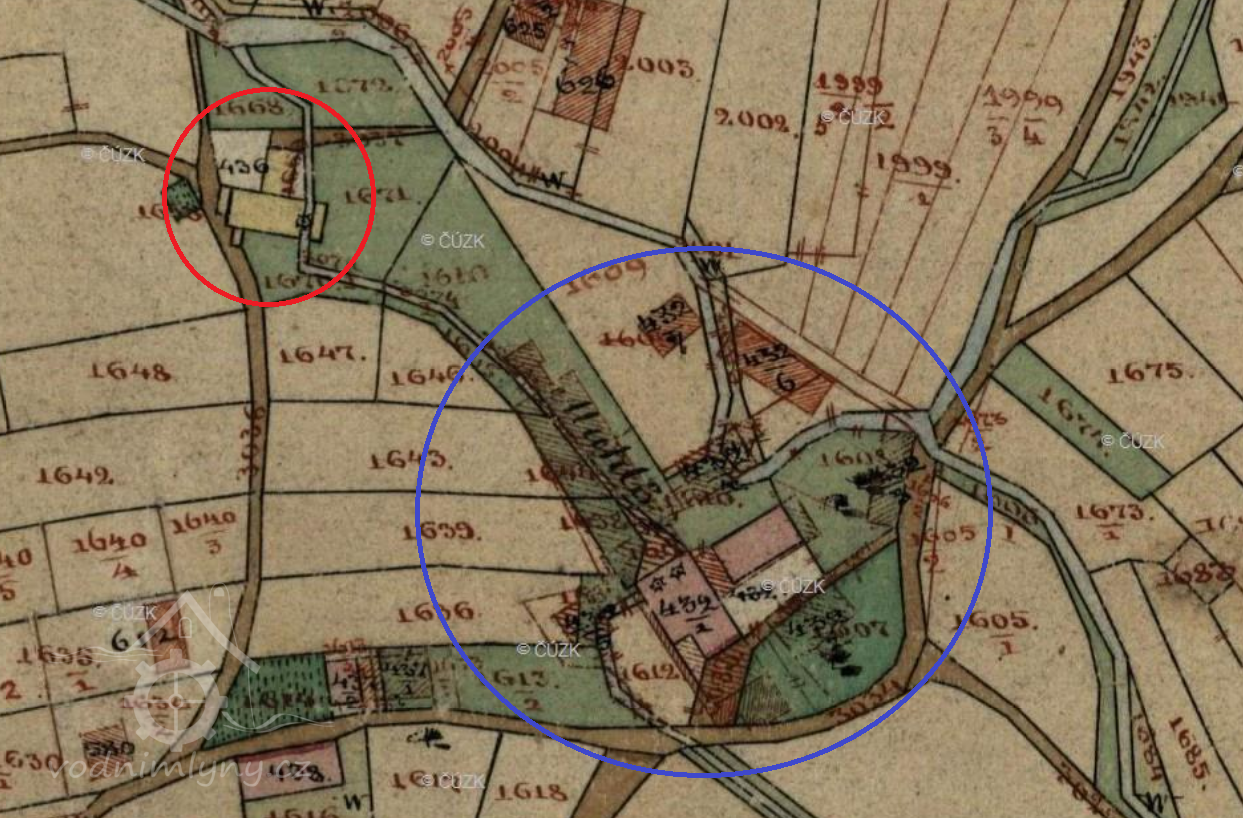 1757 Tereziánský katastr dominikál: 2 mlýny po 1 kole na nestálé vodě