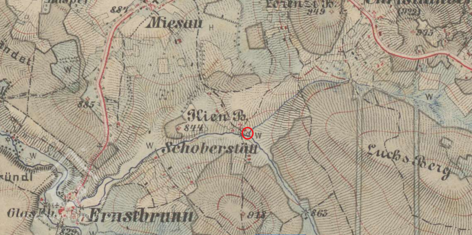 Objekt původně patřil do majetku k usedlosti čp. 7 ve Vyšném/Miesau /a původně měl číslo popisné 12.V roce 1928 dle ohlašovacího listu č.7/28 bylo domu přiděleno čp.11. V létech 1872-1895 byl mlýn majetkem manželů Franze a Barbary Mathe.