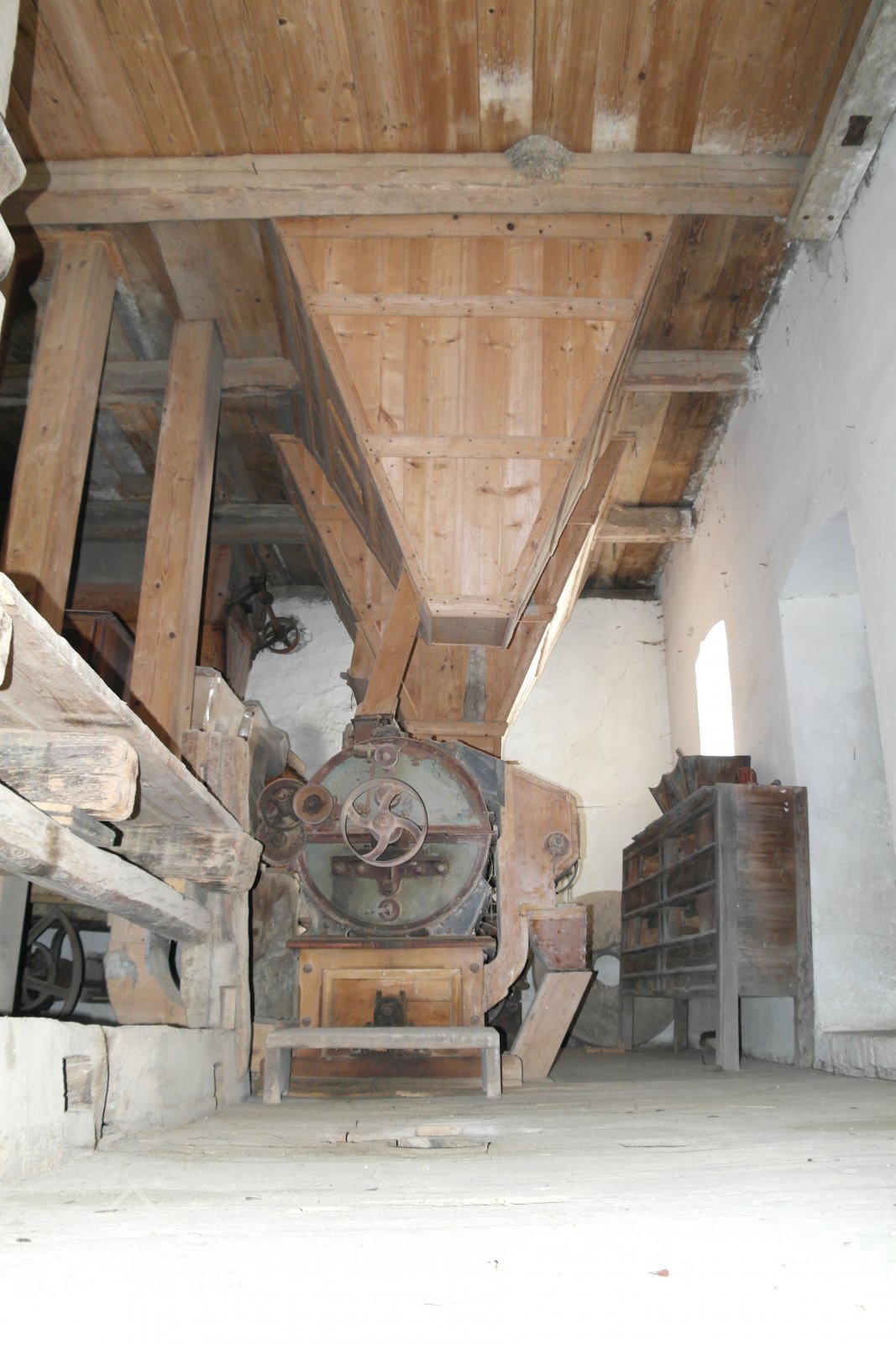 Suterén: Mlynská hranice, paleční kolo s převody a horní transmise. Násypka do korečkového výtahu.