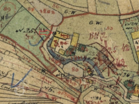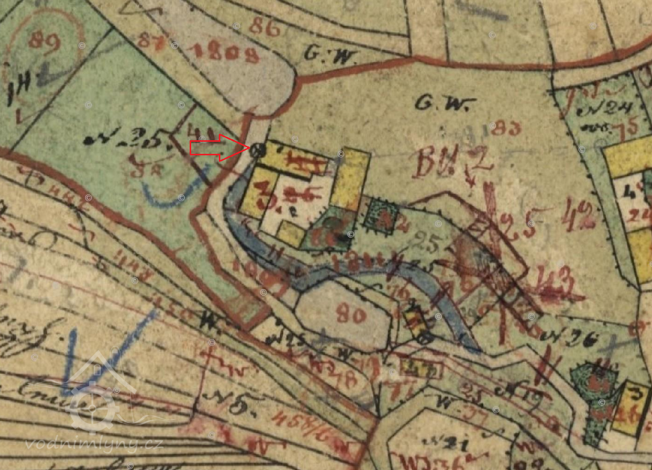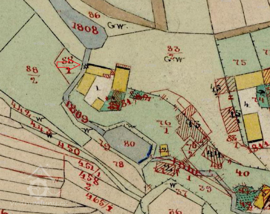 Dle vodní knihy držel mlýn v roce 1874 Anton Achterling. Za něj byl v roce 1877 u mlýna zasazen vodní cejch, který určoval výšku vodu na přítoku z vodní nádrže. Cejch měl podobu mosazné tabulky s iniciálami a letopočtem A.A. 1877. Usedlost se tehdy skládala z provozní, obytné a hospodářské části.