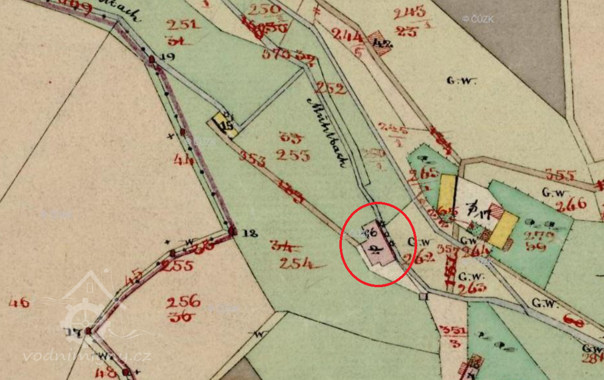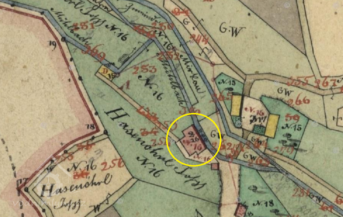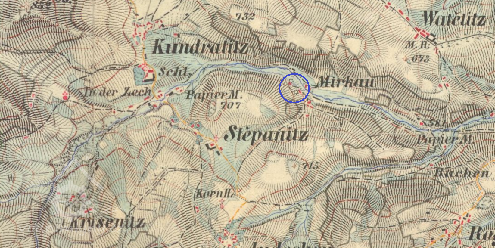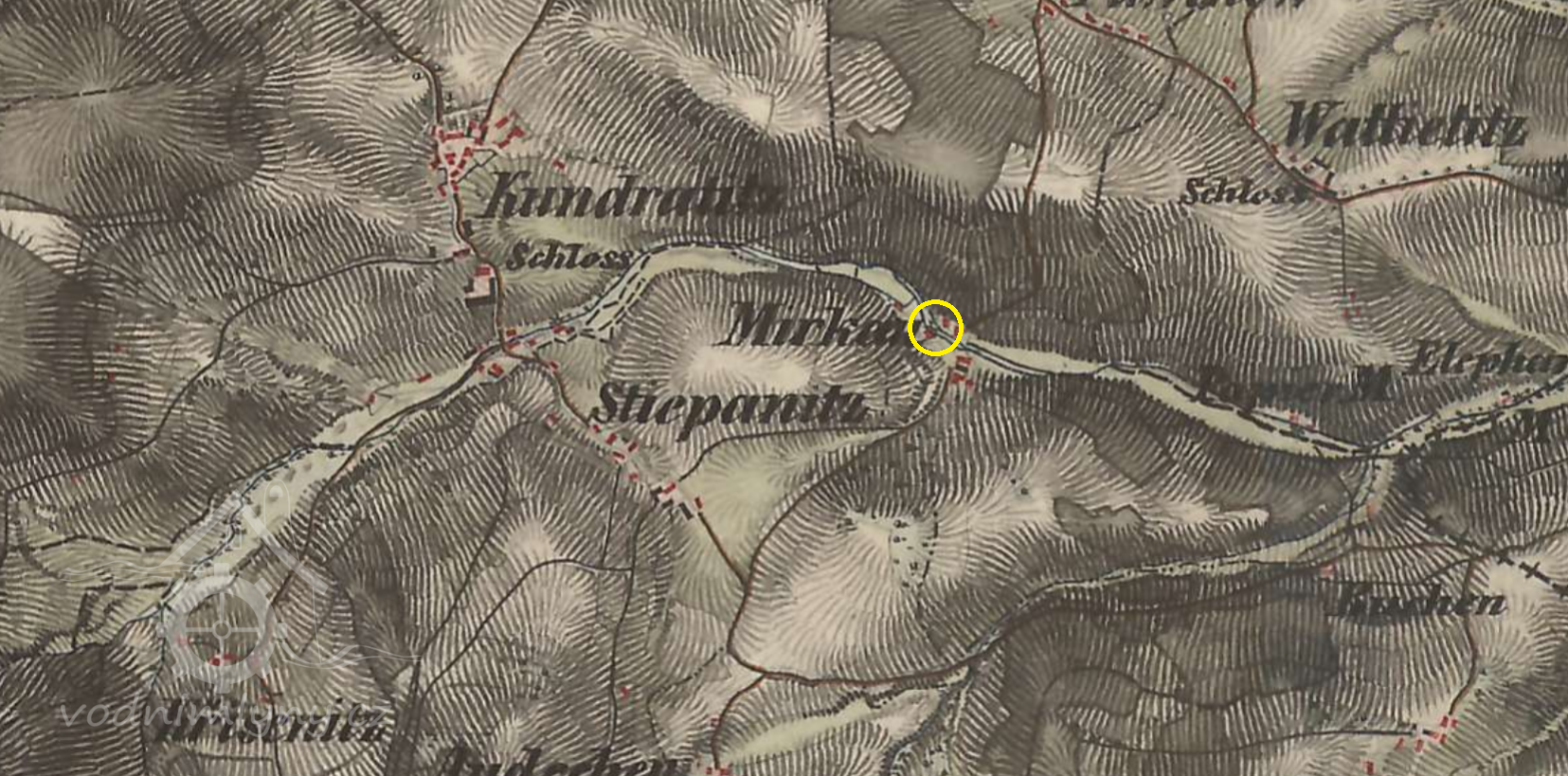 Samota v katastrálním území Štěpanice. Jednalo se o obytné a hospodářské stavení a mlýn čp. 16/st.p. 16. Nemovitost je zakreslena na mapě stabilního katastru: Čechy - 9133-1, mapový list č. 002 v původním katastrálním území Zálužice, po úpravě katastrální hranice připadla stavba do k.ú. Štěpanice. V listinách je označována jako "Wirtschaft Nro. Cons. 16 in Mirkau".
