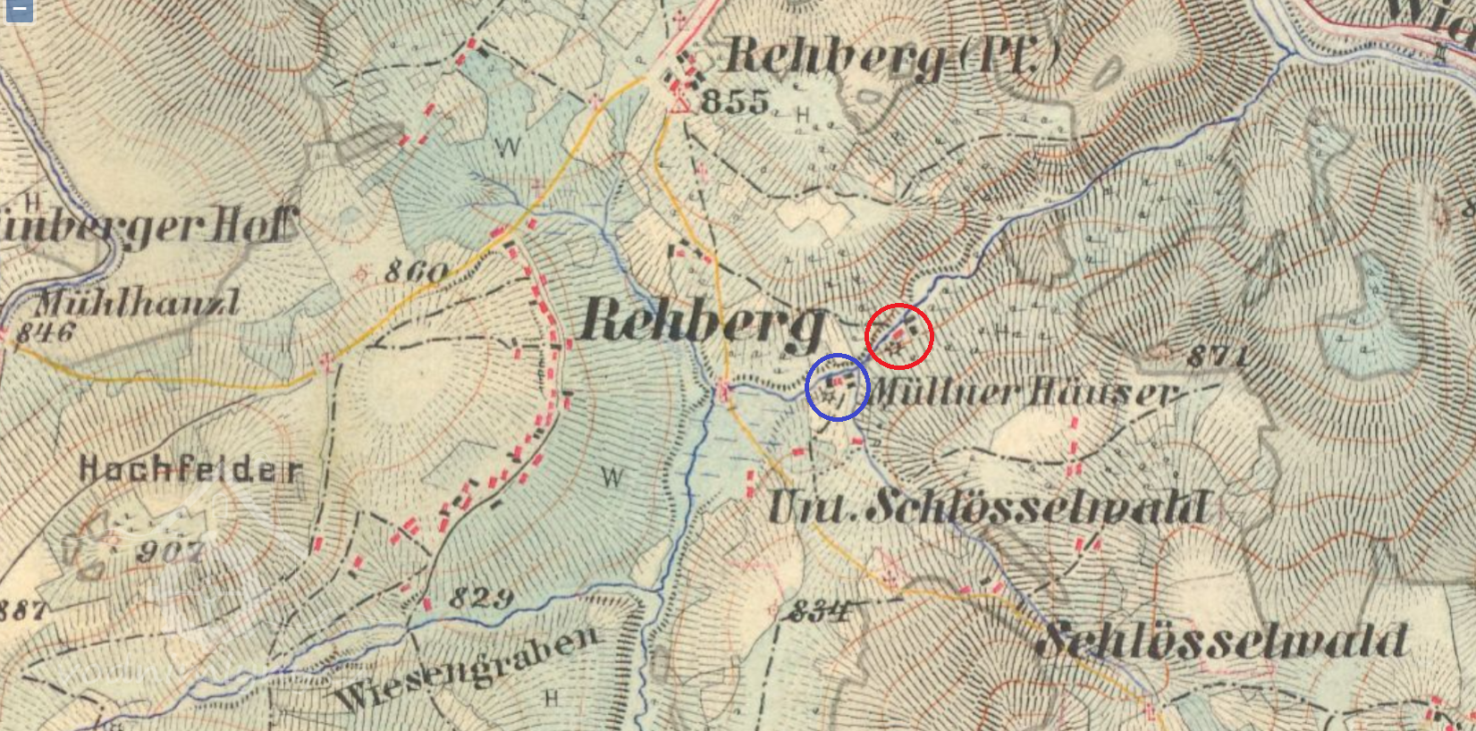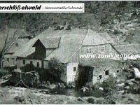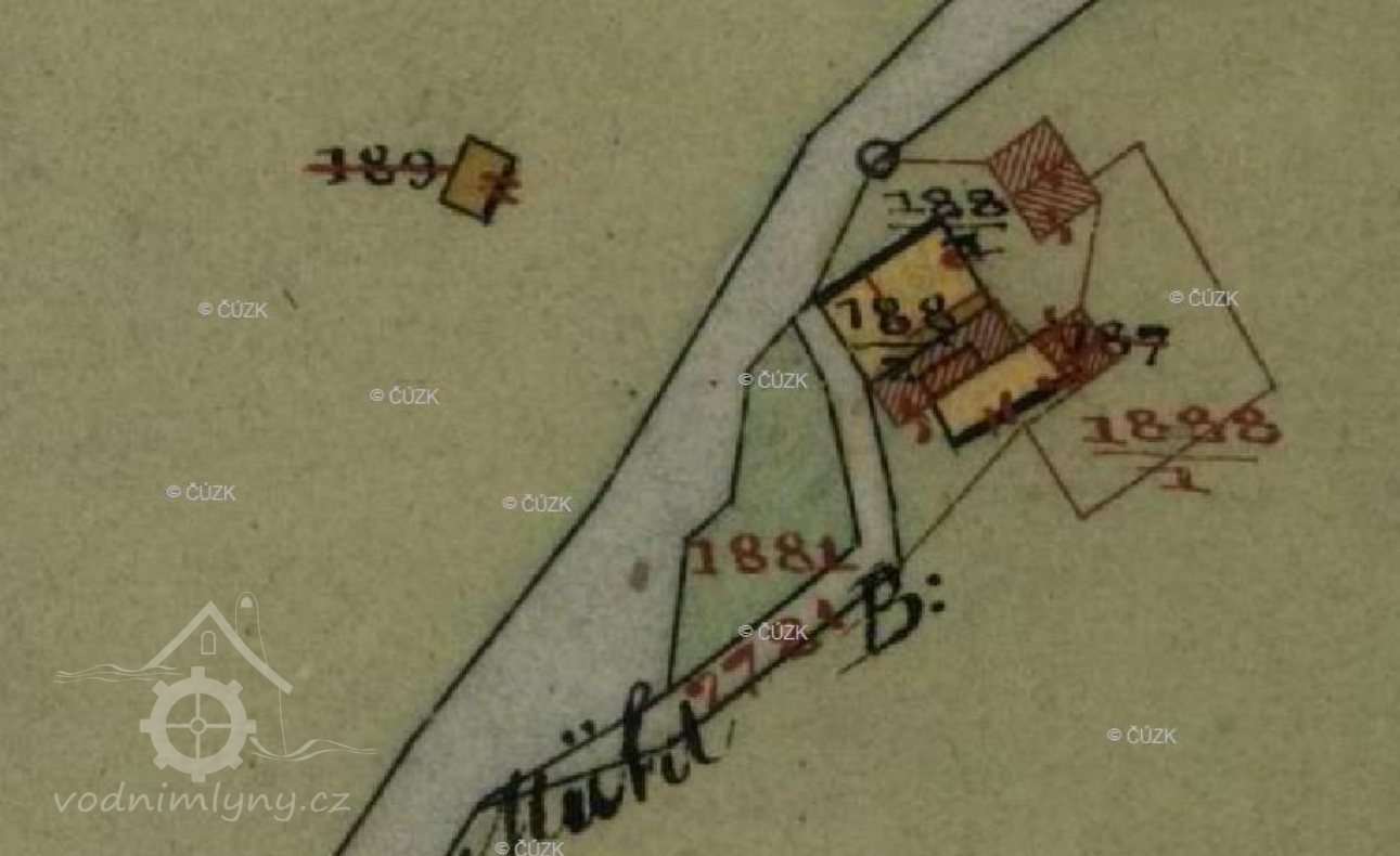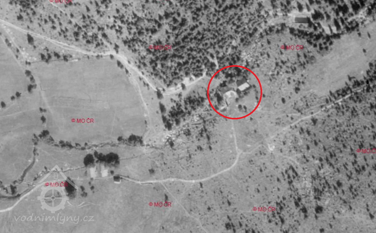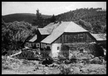 Zpět k nejstaršímu Hammermühle. Byl vystavěn v nadmořské výšce 798 metrů při pravém břehu potoka. V jakém roce byl zahájen mlýnský provoz mi není známo, ale jisté je, že Mathias Harant jako královácký svobodník v roce 1737 již v Hrádkách bydlel. Mlýnský náhon po přibližně 30 metrech pozvolna přecházel v menší akumulační nádrž. Od nádrže náhon v pravém úhlu měnil směr ke zhruba 20 m. vzdálenému vodnímu kolu Hammermühle, chráněnému v lednici (kamenný přístavek, který je vidět na fotech) při jz štítu mlýna. Před lednicí jsou též vidět vantroky s přepadem. Ve svahu na protějším břehu, vlevo u cesty od Srní, asi 40 metrů sz od mlýnské budovy, byl sklep - vchod do něj je stále zachován. Z cesty vedoucí od Srní odbočovala pěšina k malé lávce přes potok přímo před mlýnem. Cesta od Srní dále pokračovala svahem dolů k Vydře (mj. z této cesty se odbočovalo také k lesnímu koupališti vzdálenému 100 m. severovýchodním směrem od Hammerschmiede) a po jejím levém břehu vedla k Brückmühle (viz lokalita "Kramlův mlýn"). V minulosti ke mlýnu vedla cesta pouze po druhém břehu, která odbočovala z hlavní cesty Srní-Modrava doleva hned za mostem (v místě nynějšího silničního mostu) kolem Manimühle. Kovárna při mlýně (pravděpodobně budova níže po po proudu - ale není to zcela jisté - různé údaje se totiž rozchází) fungovala prokazatelně již v roce 1851. Měla svůj vlastní náhon, který začínal před budovou mlýna. První zdejší mně známý hamerník byl Johann Hofmann. Vodní kolo bylo umístěné v lednici při severní straně kovárny směrem k potoku. Jak je zachyceno v orig.mapě stab. kat. (viz obrázek č. 1 v sekci "Ostatní"), v čase došlo ke zvětšení mlýnské budovy jv směrem od potoka, zániku objektů na st.p. 187 a 189 a vzniku nových staveb, čímž byla st.parcela 188 postupně rozdělena až na pět dílů - viz příspěvek p. Vlčka v komentářích. Obytný objekt s kovárnou měl čp. 66 (pův. mlýnské čp. 144) a vedlejší budova zahrnovala obytnou část čp. 167 a mlýnici.