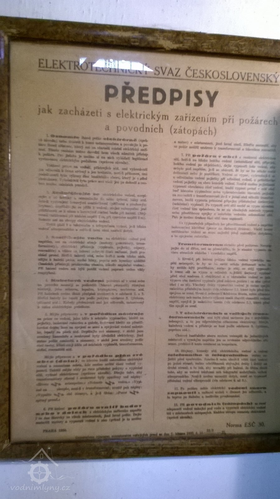 1930: 1 kolo na svrchní vodu, hltnost 0,095 m3/s, spád 4,5 m, výkon 3,7 HP