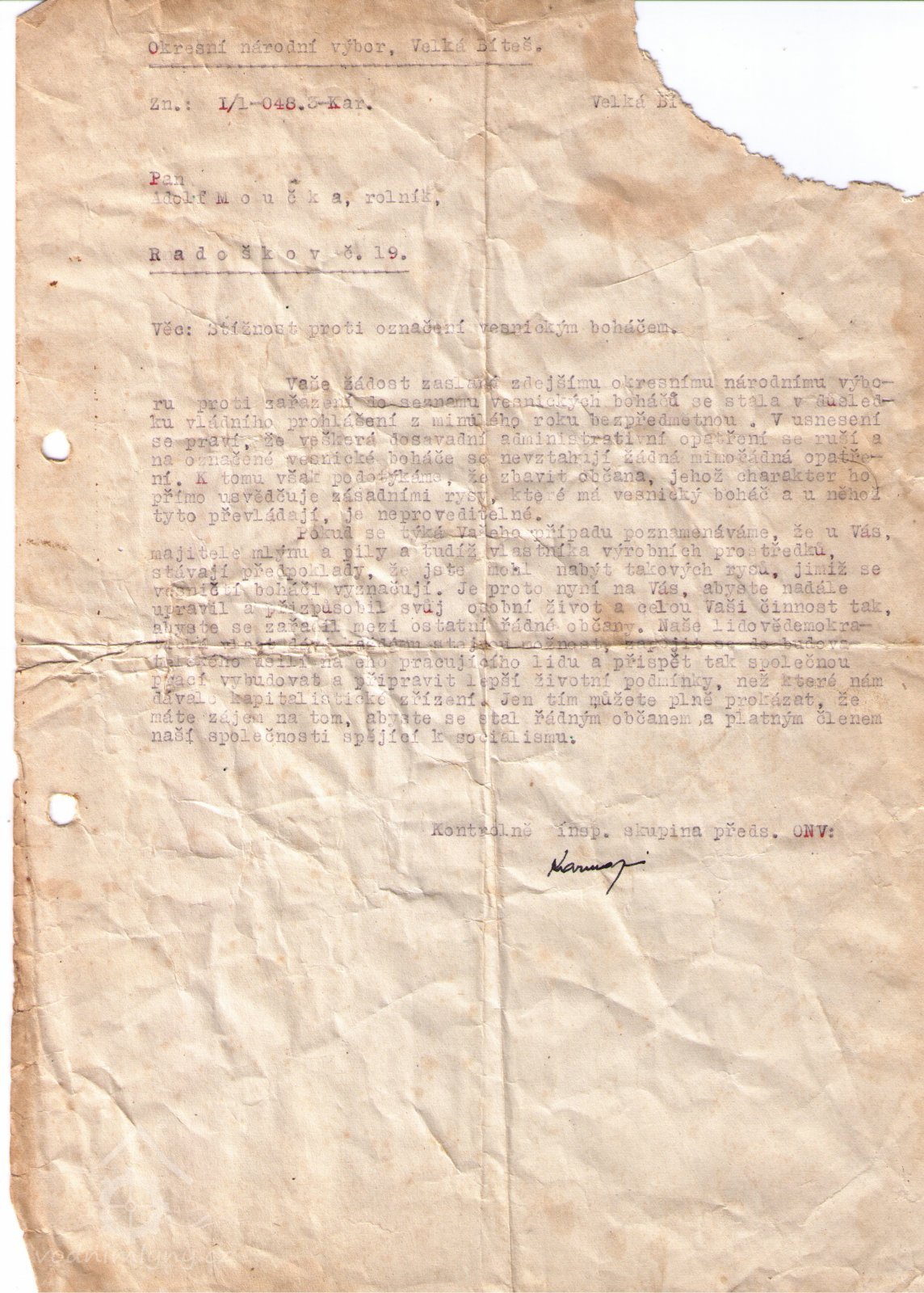 1862 se ve Štěpánovicích žení Josef Čížek, mlynář v Radoškově (asi Spálený, Moučkův mlýn) s místní Františkou Matouškovou. Josef je synem, vnukem a pravnukem Čížků, mlynářů z Víckova č. 8.