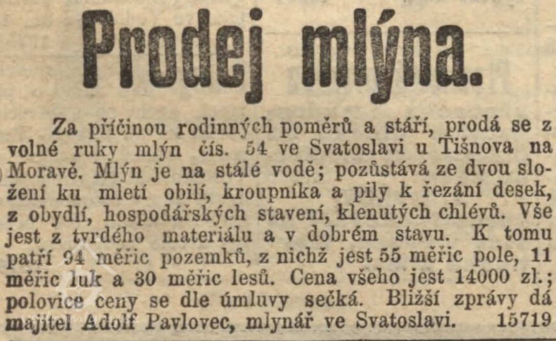 1897 prodej mlýna za 14.000 zl., majitel Adolf Pavlovec. (RR)