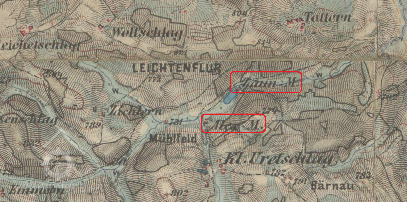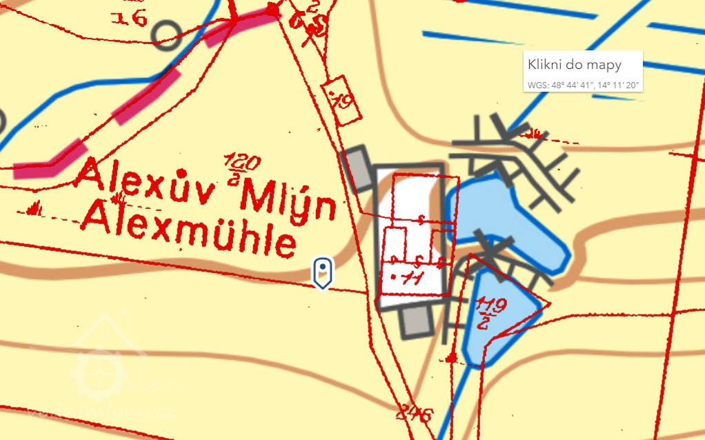 Mlýn na bezejmenném toku povodí Čertice, stavení č.p. 10, patřící rodině Mugrauer.