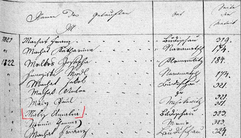 5.8.1822 se zde narodila Amalie Malá, matka malíře Alfonse Muchy
