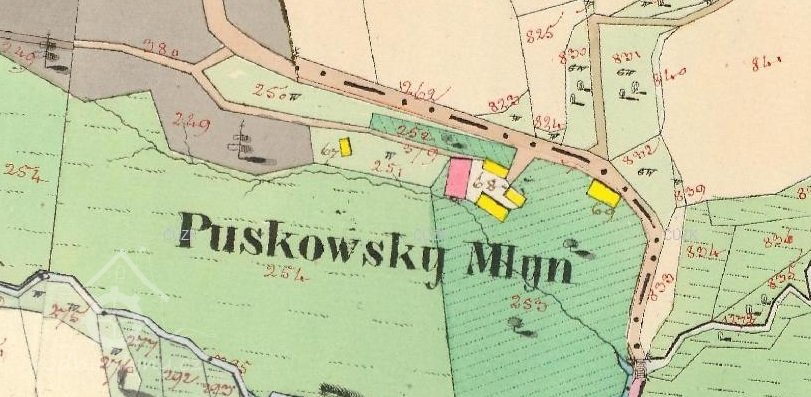 Pod martinovským dvorem s rozprostíraly ,,..... lúčky po hranicích pustkovskou a s lesem Okovicí, jenž v gruntě martinovské jest. .... po levé ruce lúčka Niva, která má náležeti do Pustkovce, poněvadž mlýnek někdy na gruntě pustkovském byl zbudován.