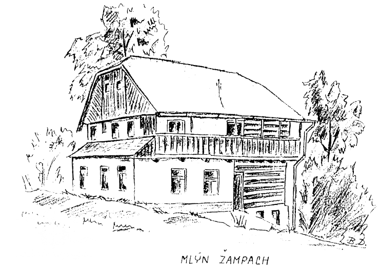 Poslední mlynářka v Žampachu byla pí. Náhlovská, podle které se ve mlýně vystřídalo 13 generací mlynářů - info: současný majitel mlýna p. Šperlink.