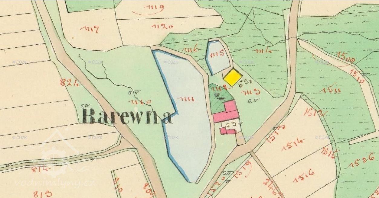 Původní mlýn vznikl zřejmě až někdy na konci 18. stol., ale nefungoval příliš dlouho, neboť na mapě z roku 1838 je už zakreslen jako barvírna.