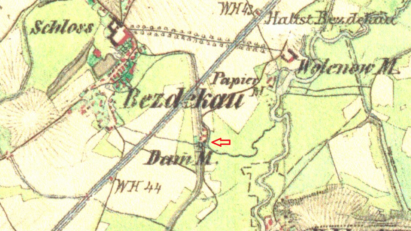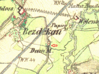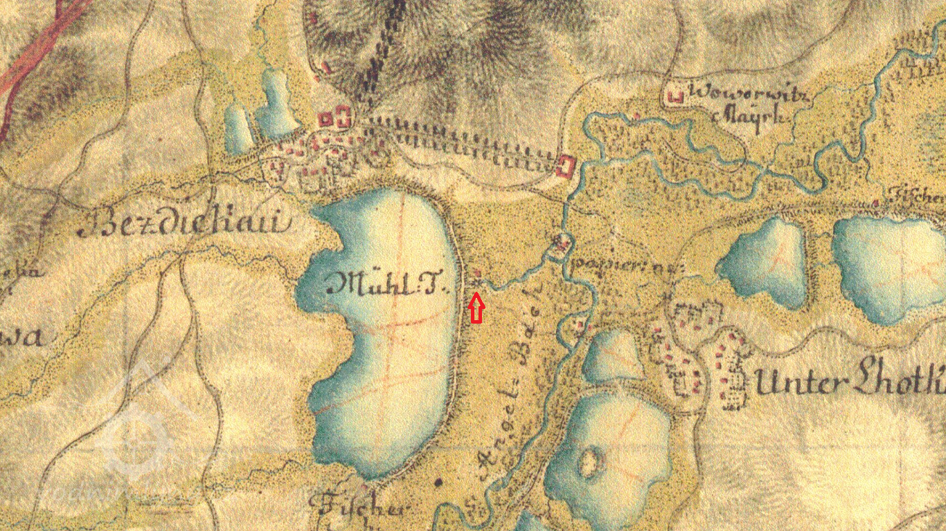- PO zrušena 1) obytné stavení s mlýnicí 2) hospodářský trakt 3) stodola Původně komplex budov seskupených kolem čtvercového dvora, tvořený obytnou částí s mlýnicí na sz. straně areálu, protilehlým hospodářským traktem na východní straně dvora a obdélnou stodolou na jižní straně; průčelí hlavní obytné budovy s mlýnicí spojeno vstupní branou s hospodářským traktem. Voda ke mlýnu byla přiháněla od jihu náhonem na mohutném náspu, který ústil na betonové vantroky a dvojici kol na svrchní vodu (náhon bez památkové ochrany). V současnosti celý areál v rozvalinách (viz. stav zachování). Popis dle stavu v r. 1969: Obytná a někdejší provozní budova jednopatrová, na obdélném půdorysu, o severním dvouosém průčelí, krytá mansardovou střechou. Na bočním dvorním průčelí ve středové ose prostý vchod, z něho přístup do obytné prostory s trámovým stropem, do místnosti s valenou klenbou s lunetami a na schody do patra; v zadní jižní části budovy někdejší mlýnice, v patře rovné stropy. Na průčelí navazovala v pravém úhlu brána s širokým polokruhovým vjezdem, po jeho stranách drobné niky, nad obloukem, téměř v celé šíři brány, posazena nízká atika s kasulovým vykrojením středu, vázou a čučky. Obytné stavení s mlýnicí ze smíšeného zdiva, hospodářské objekty převážně z lomového kamene.