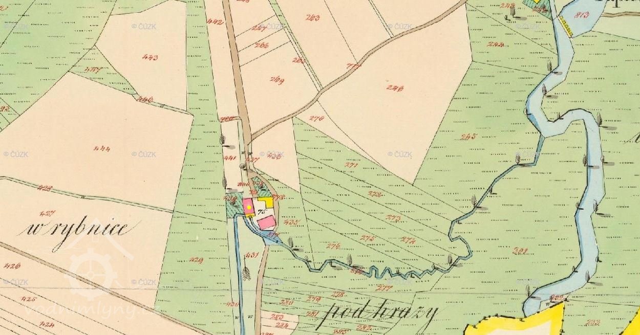 Mlýn stával původně pod hrází velkého rybníka, na staré mapě označeného jako mlýnský, po jeho zrušení přiváděl vodu ke mlýnu značně dlouhý náhon, ze kterého se dochoval horní úsek a malá část u mlýna.