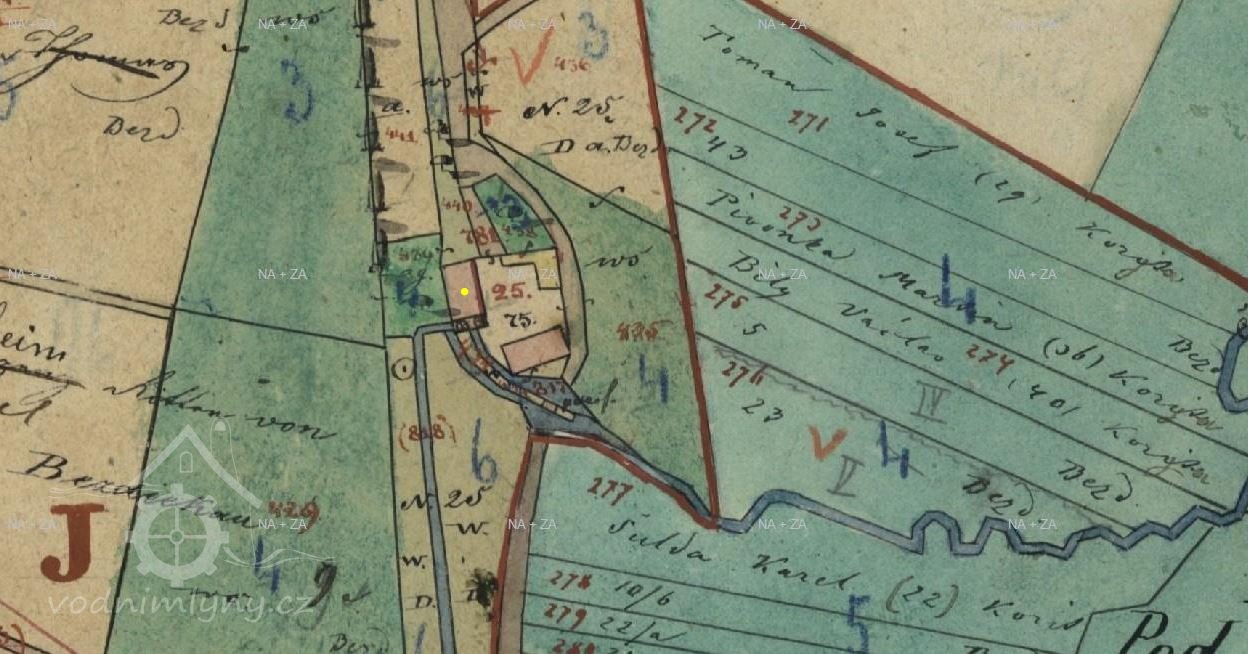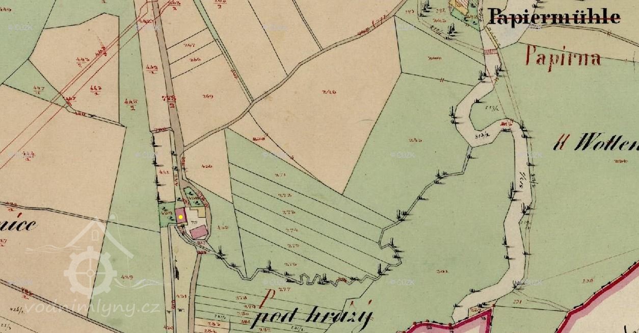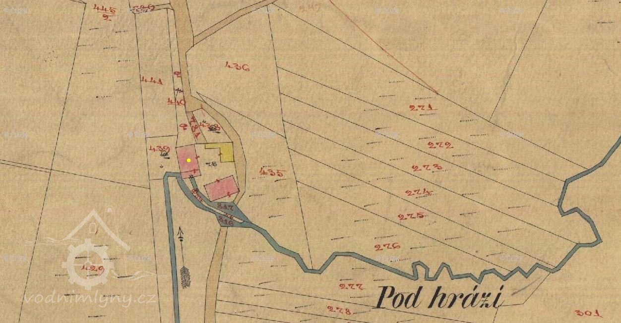 PopisV roce 1930 pohání mlýn 2 kola na svrchní vodu s průtokem 0.276 m3/s, spádem 3.8 m o výkonu 9 HP.