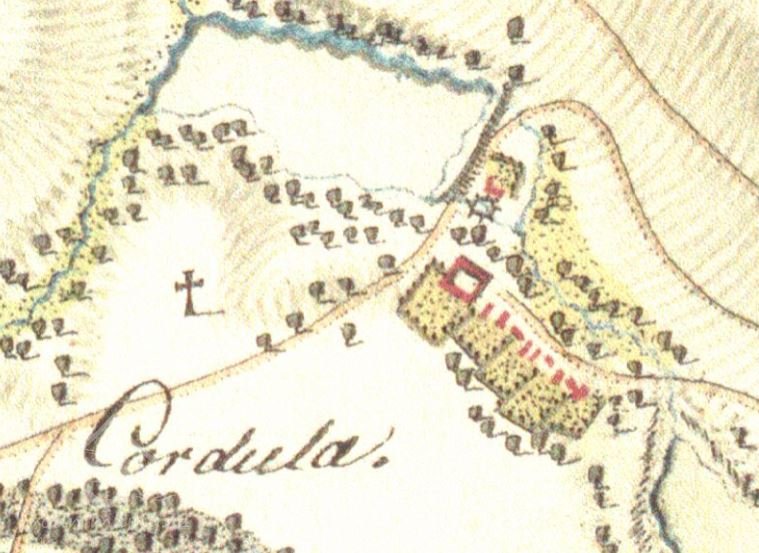 V letech 1764 - 1768 byl mlýn zaznamenán na mapě 1. vojenského (josefského) mapování, kde je severně od osady Kordula zřetelná značka, která byla používána pro mlýny.