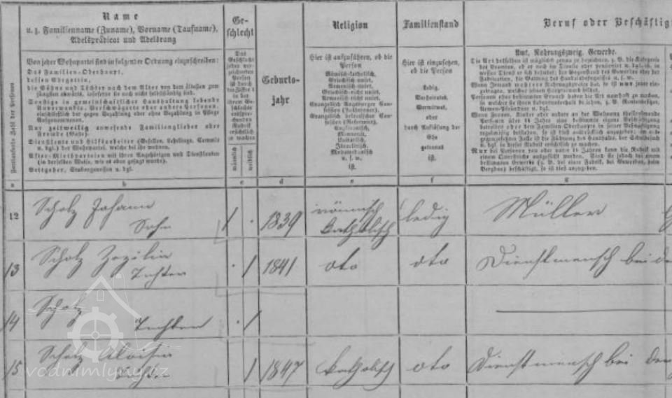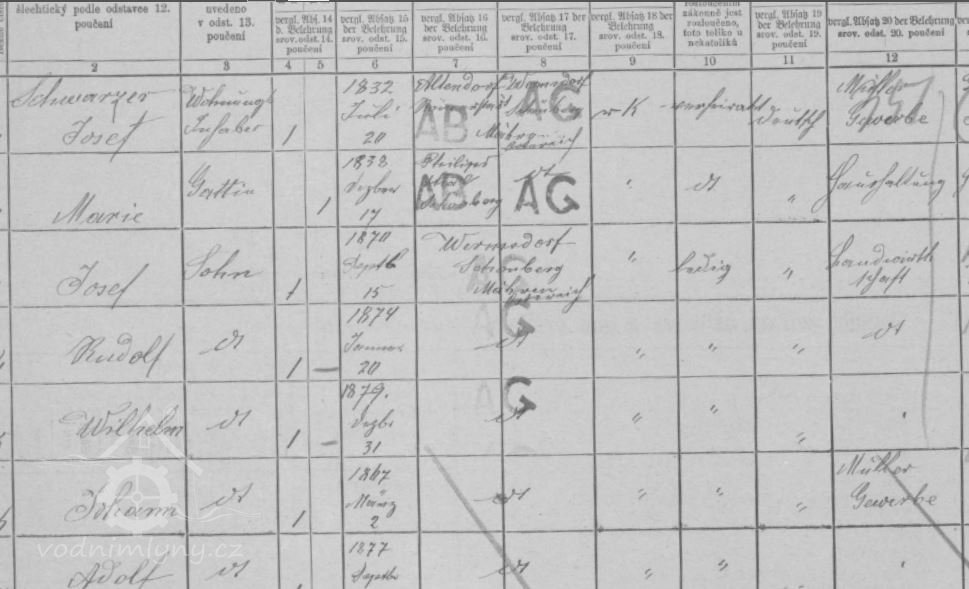 V roce 1869, 1880 i 1890 mlýn provozuje mlynář Josef Schwarzer, nar. 1832.