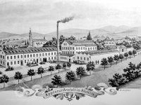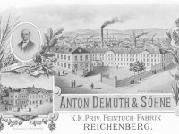 Továrnu nechala postavit firma Antona Demutha, který patřil do první generace továrníků-obchodníků. Společnost založil Anton Bernard Demuth již v roce 1808 a v roce 1826 převzal i klientelu svého tchána Gottfrieda Mölera patřícího do stejné skupiny obchodních a továrních pionýrů. V roce 1835 koupil rochlický mlýn, který přestavěl na dodnes existující továrnu stojící nedaleko Poštovního náměstí, v roce 1842 nechal postavit další tovární blok v samém centru Liberce. Roku 1852 byla továrna na dnešní třídě 1. máje dále rozšířena, další přestavba proběhla pod dohledem architekta Antona Ferdinanda Miksche v roce 1870. Zaříznutí jedné budovy tak, aby vyhovovala uliční linii, proběhlo v roce 1909. Dochovaná empírová hlavní budova se dnes nachází ve vnitřním bloku. Trojúhelníkový empírový štít je sice narušen dostavbou strojovny výtahu, ale stále nese i kulaté okno štítových hodin. Spolu se Schmidtovou továrnou na Papírovém náměstí se jedná snad o nejzachovalejší tovární objekt z první poloviny 19. století v Liberci.