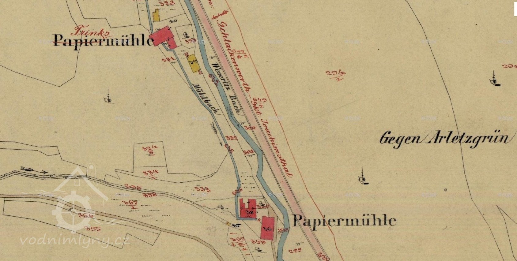 Další mlýn byl vlastně dvojmlýnem. První zmínka pochází z roku 1546, kdy jeden z těchto mlýnů (horní), fungující jako papírna, zakoupil Adam Abt. Z prostor papírny se stala lázeňskými hosty z Jáchymova vyhledávaná restaurace a z Papirmühle Abt se tak stal Trinksmühle. Dolní pila byla v provozu do poloviny dvacátého století. Pila byla poháněna pětimetrovým kolem a posledními majiteli byli Maria a Alfred Blehovi. Později byl objekt přestavěn na pension MUT a v současnosti (2016) zde probíhají stavební práce a další úpravy objektu.