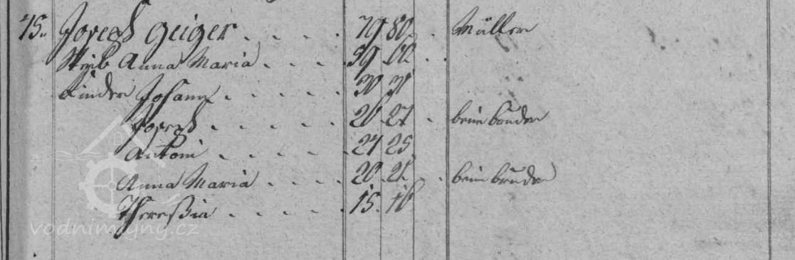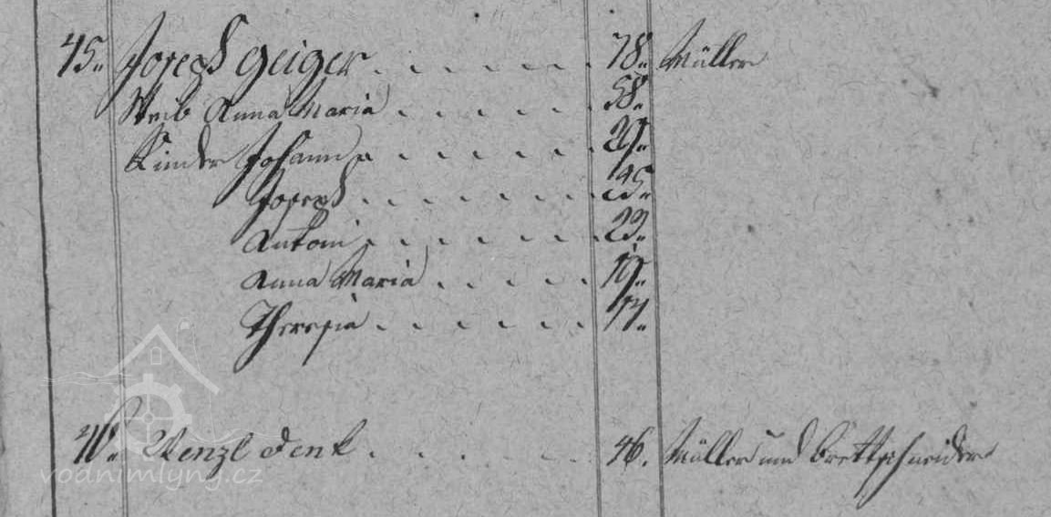 V soupise poddanách z roku 1799 je v čp. 45 uveden mlynář Jozepf Geiger, který mlýn vlastní do své smrti v roce 1806, mezi lety 1806 - 1815 mlýn vlastní vdova po mlynáři Anna Maria Geiger, od roku 1815 Johann Geiger a od roku 1819 Anton Geiger.