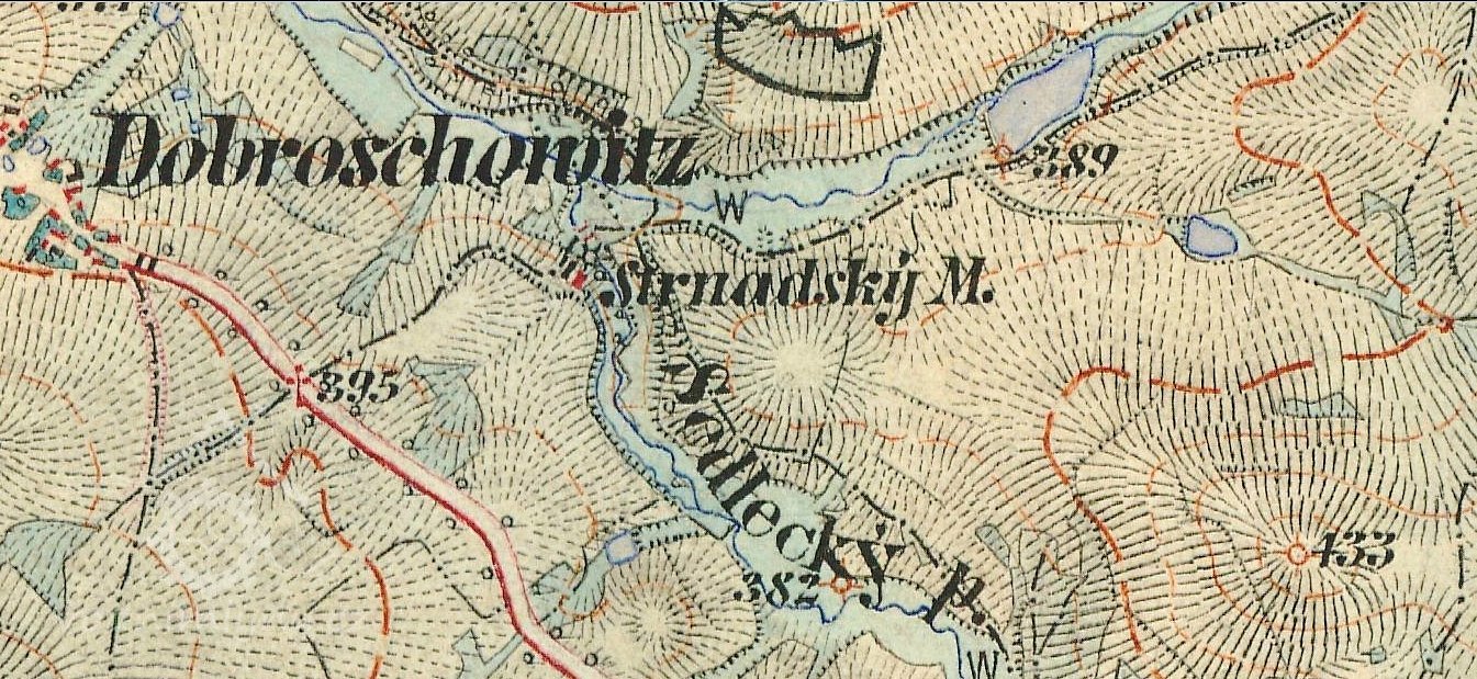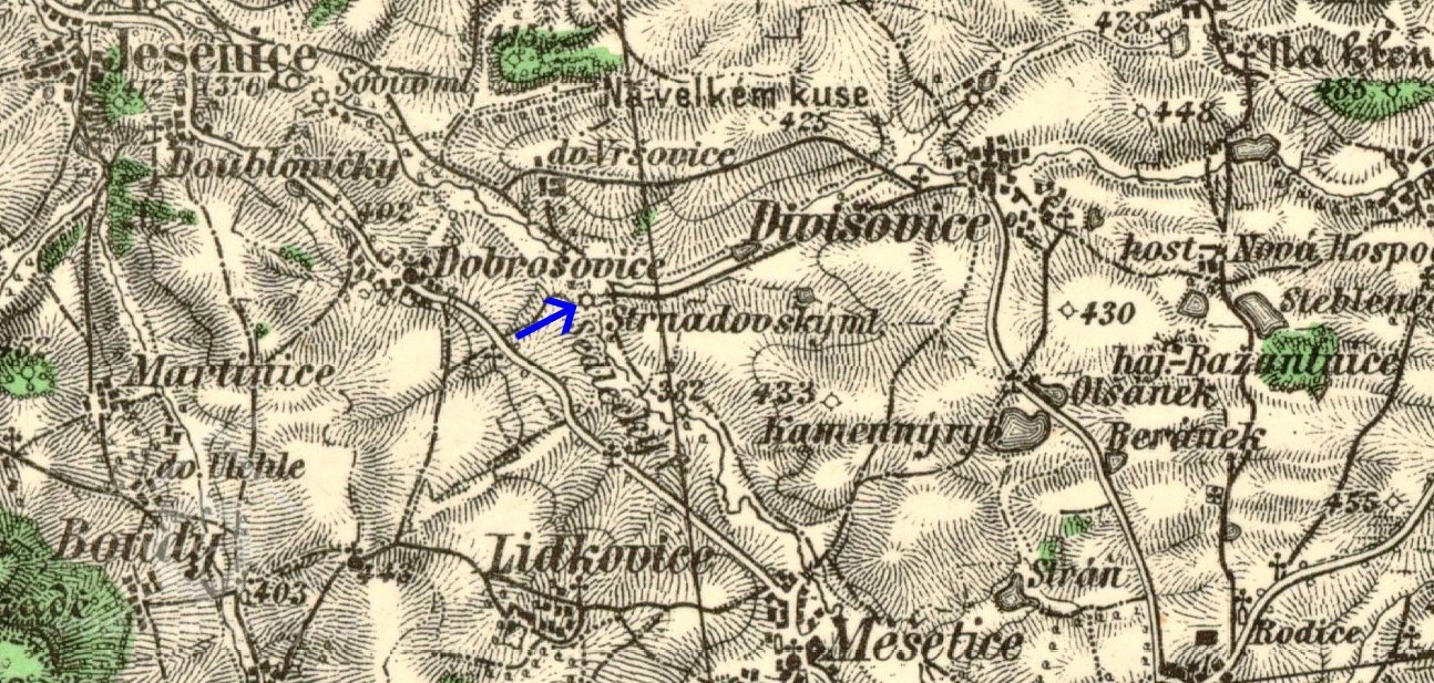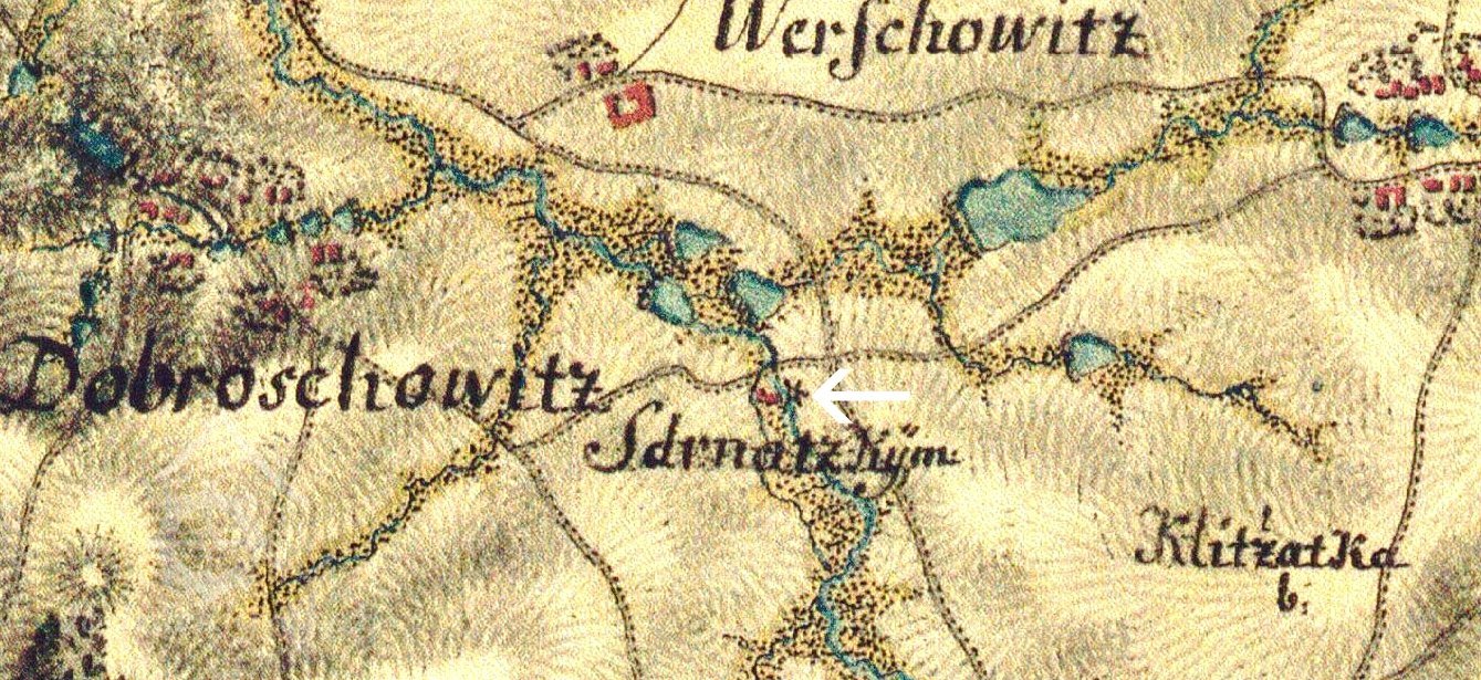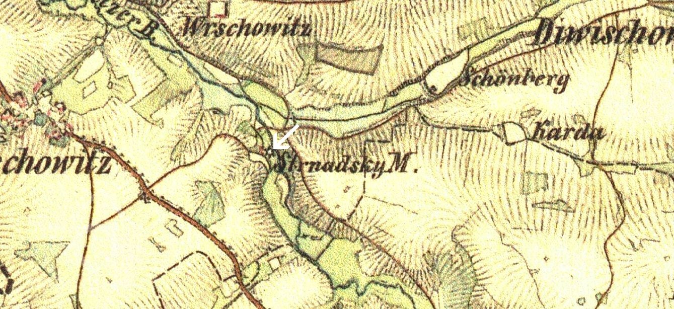 1539 bratři Růtové z Dírného prodávají statek Jesenický, zmíněn kus potoka nad mlýnem Strnadským