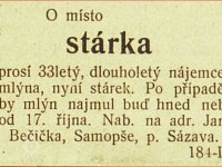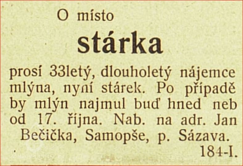 /V r. 1914 působil na mlýně jako stárek Jan Bečička, jinak nájemný mlynář (působil též na Hodovském mlýně u Úval, v Otvovicích u Kralup nad Vltavou aj.) - doplnil MŠr./
