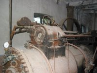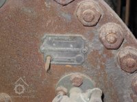 Detail parního strroje s výrobním štítkem, 2013, © Vodní mlýny na Frýdecko-Místecku, (Prvky na obrázku: Pomocný motor, značka výrobce na vodním motoru)