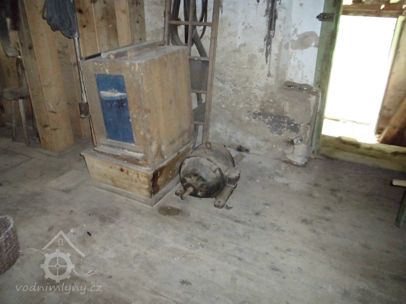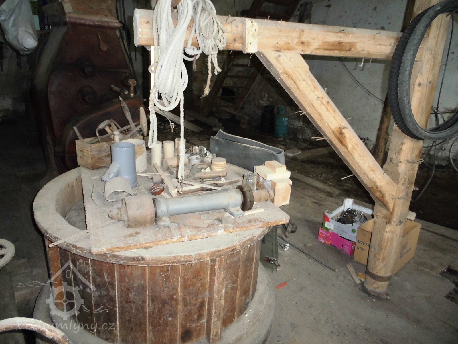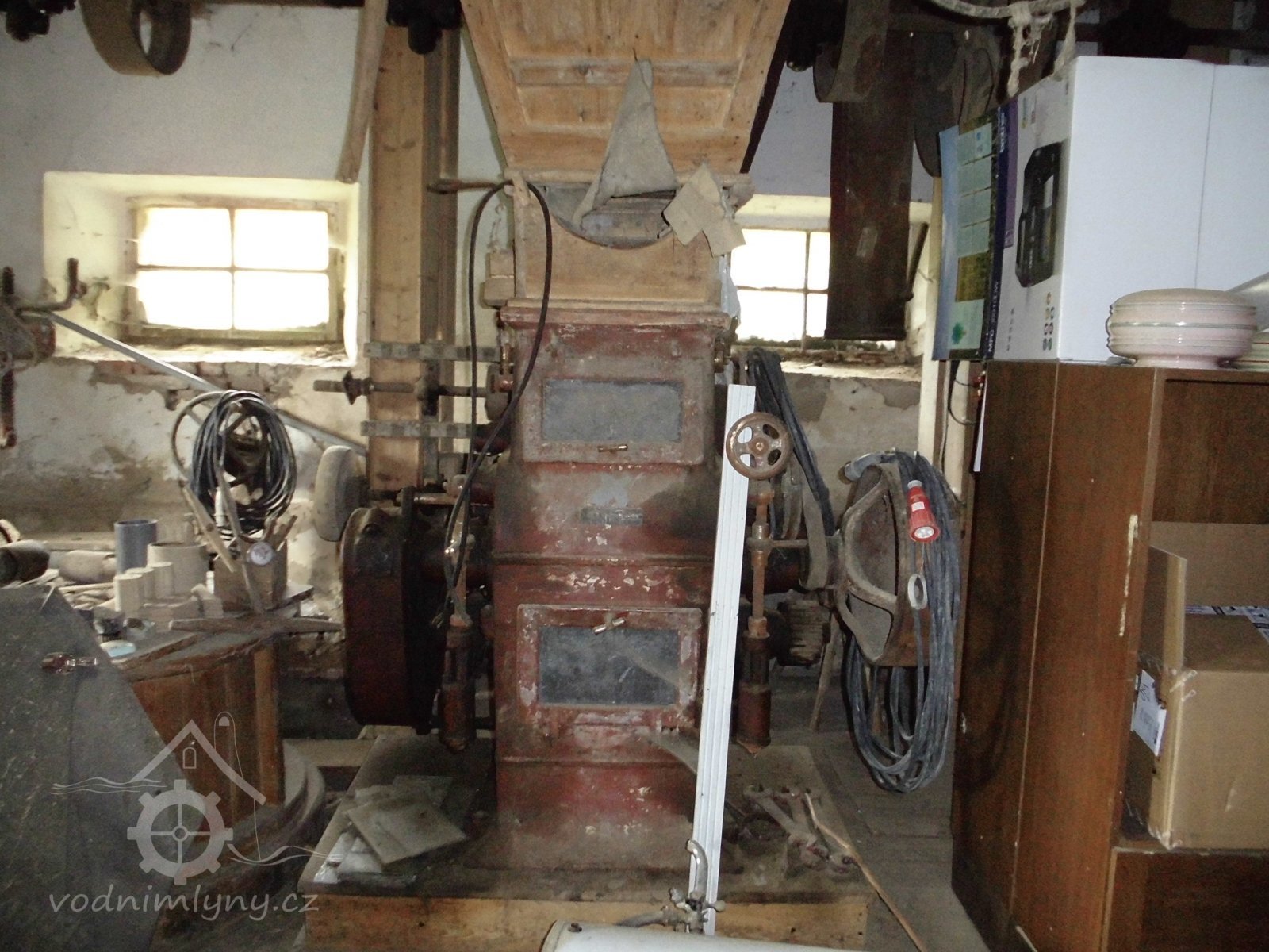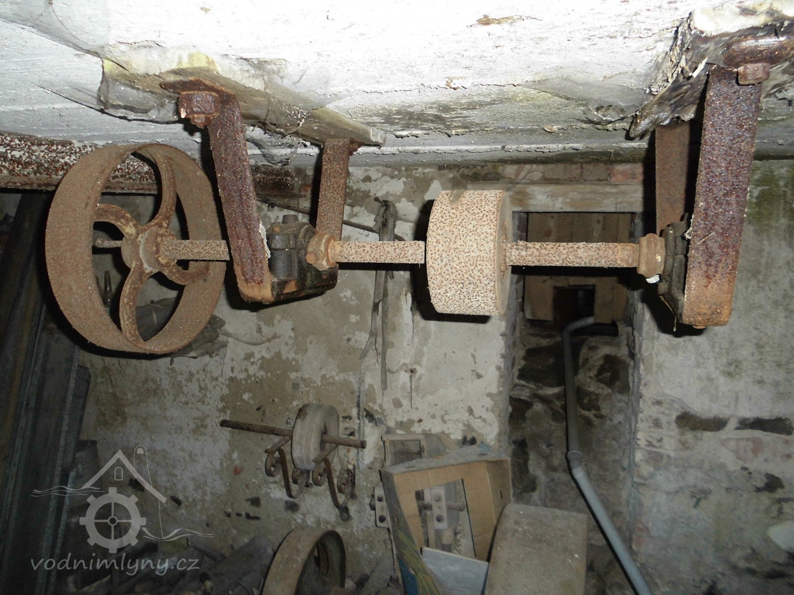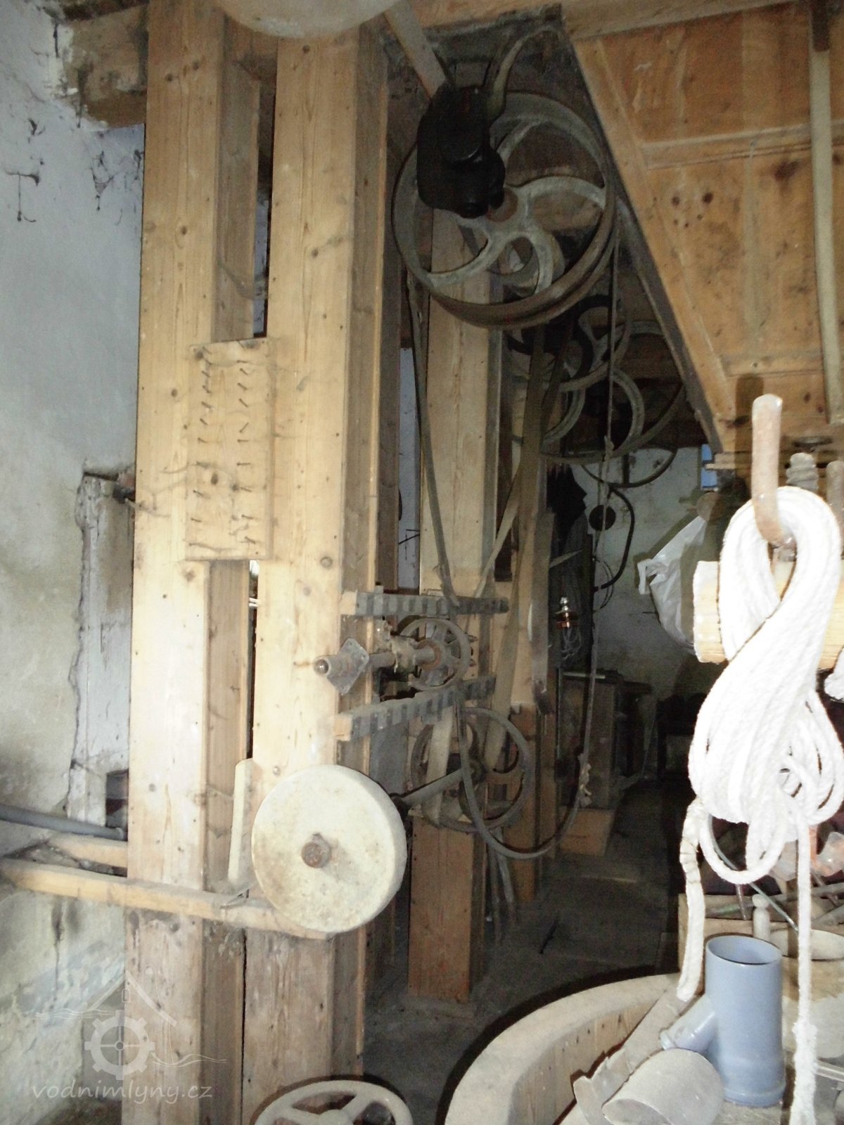 mlýnice, 2014, © Veselý, (Prvky na obrázku: transmise, řemenice, převody, kamenné složení (šrotovací, mlecí), válcová stolice, zásobník, násypka)