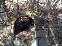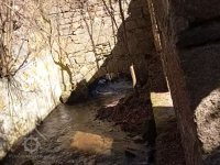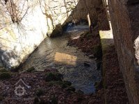 Přívod vody zřejmě z jezu, voda přivedená přítokovým kanálem dosud protéká přímo stavbou, vodní kolo mohlo být uprostřed stavby???