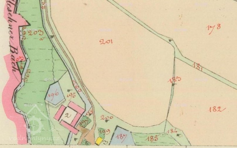 PopisV roce 1930 měl mlýn 1 kolo na vrchní vodu, hltnost 0,066 m3/s, spád 4,7 m, výkon 2,7 HP.