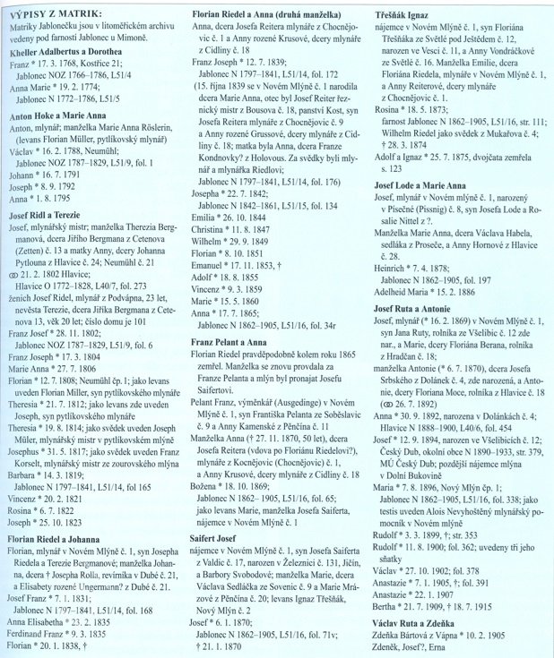 V roce 1802 měl v hlavickém kostele svatbu mlynář z Podvápna Josef Ridl. Za manželku si bral Terezii Bergmannovou z Cetenova. Do roku 1823 se jim na mlýně narodilo 11 dětí. U křtů těchto dětí jsou často jako kmotři zapsáni mlynáři ze sousedních mlýnů Josef Müller a Florián Müller z Pytlíkovského mlýna a Franz Korselt ze mlýna v Zourově. Jako čtvrtý v řadě dětí se narodil syn Florián (1808), který pak po otci převzal mlynářské řemeslo. Florián Ridl (Riedel) se oženil s Johannou Rollovou z Dubé. Když se jim v roce 1831 narodilo první dítě, syn Josef Franz, je již Florián v matrice uváděn jako  mlynář v Novém Mlýně č. 1. Do roku 1838 se jim ještě narodily další 3 děti, Anna Elisabetha (1835) Ferdinand Franz (1836) a Florian (1838). V roce 1838 Johanna zemřela a Florian Riedel se znovu oženil. Jeho druhou ženou byla Anna, dcera mlynáře Josefa Reitera z Chocnějovic. V letech 1839 – 1865 se ji narodilo celkem 11 dětí. (MH)