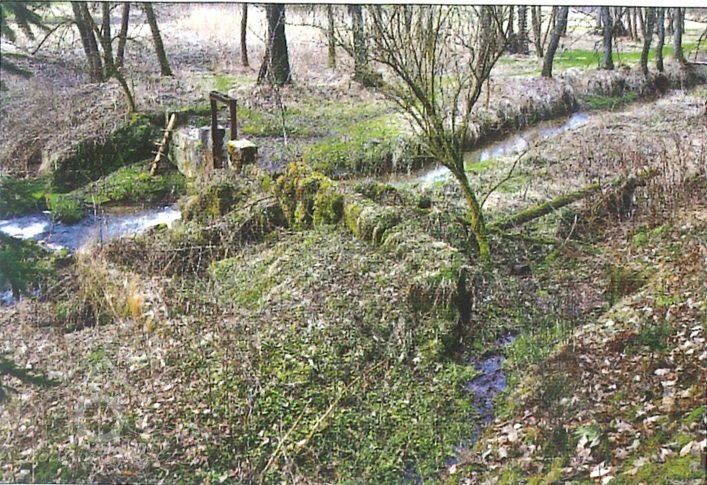 Ve vzdálenosti 360 m nad mlýnem byl na Zábrdce jez tvořený třemi stavidly o šířce jednotlivých částí zleva 1,16 m, 1,56 m a 1,41 m. Výška u všech stavidel byla 1,42 m. Mlýnský náhon začínal na levém břehu potoka. Na skalní stěně vedle něj byl umístěn vodní cejch – do skály vyrytá horizontální rýha se dvěma značkami ve tvaru písmene V. Rýha označovala nejvyšší hladinu, kterou mohla zadržená voda nad stavidly dosáhnout. (MH)