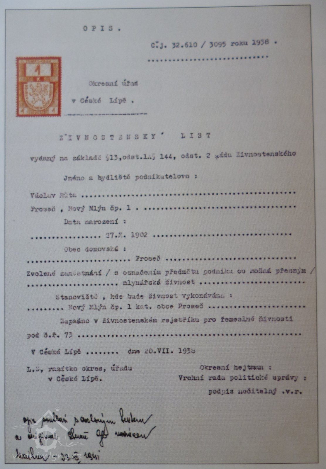 1938 semlel denně 24 q pšenize a žita, pouze námezdní mletí