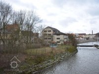 Zadní část mlýna dosahuje na menší ostrov v řece.