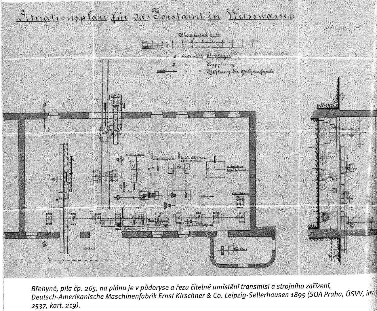 1834 dle topografie J.G.Sommera bělidlo s denní produkcí 200 kop látky, barvírna s parními i obyčejnýmí kotly a sušicím strojem, samostatný objekt sušárny, 2 valchy, holanský mandl
