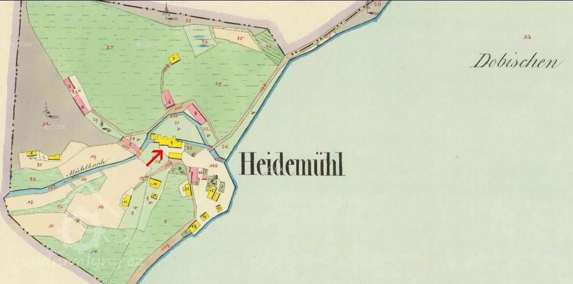 r. 1711 - emfyteuticky zakoupil mlynář Georg Woditschka za 300 kop gr. míš. (50 kop hotově, 10 kop roční splátka), roční plat do důchodu 60 zl. + 5 zl. náhradou za vykrmení vepřů. Z panského důchodu hrazeny mlecí kameny - 1 zl. 30 kr, běkoun a 45 kr. ležák, dopravu kamenů a jedné fůry bukového dřeva na opravy zajišťují robotníci, jednou za 3 roky nárok na výměnu hřídele kola a katru pily, pro vrchnost se mele a šrotuje bezplatně. Přísluší sem mleči z Břehyně a Oken, z každého semletého strychu sí mlynář ponechává 1/8 měřice. Ke mlýnu náležejí chlévy vyjma panského teletníku, kusy polí a luk a haltýř na ryby.