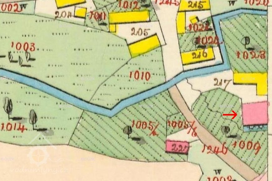 1713 přiznávací vrchnostenská fase: mlýn s jedním složením a třemi stoupami na nestálé vodě, letního času suchého, již mnoho let stojí