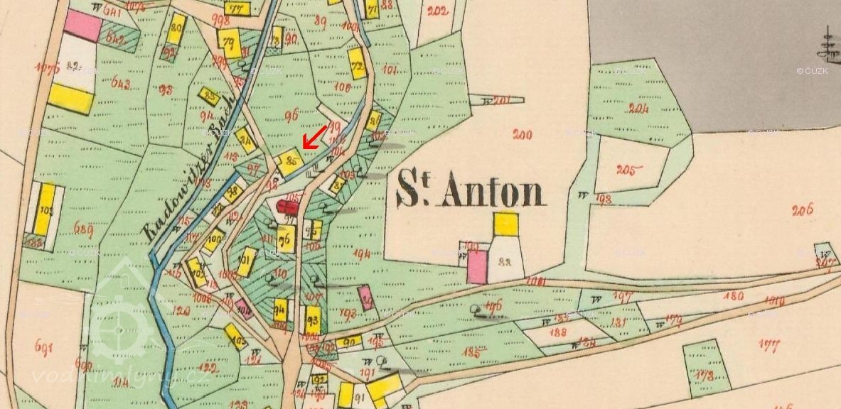 Vlevo od okna je dochována datace 1701, opakující se nad náhonem před mlýnem spolu s dalšími mladšími letopočty. V čelní stěně skalního masivu ústí náhon vedený štolou a následně otevřeným pískovcovým korytem mezi patou skalní stráně a místní komunikací až ke mlýnu pod kaplí sv. Antonína. Lednice s dochovanou hřídelí vodního kola na horní vodu je vymezena vysokou odlámanou stěnou a budovou mlýna.